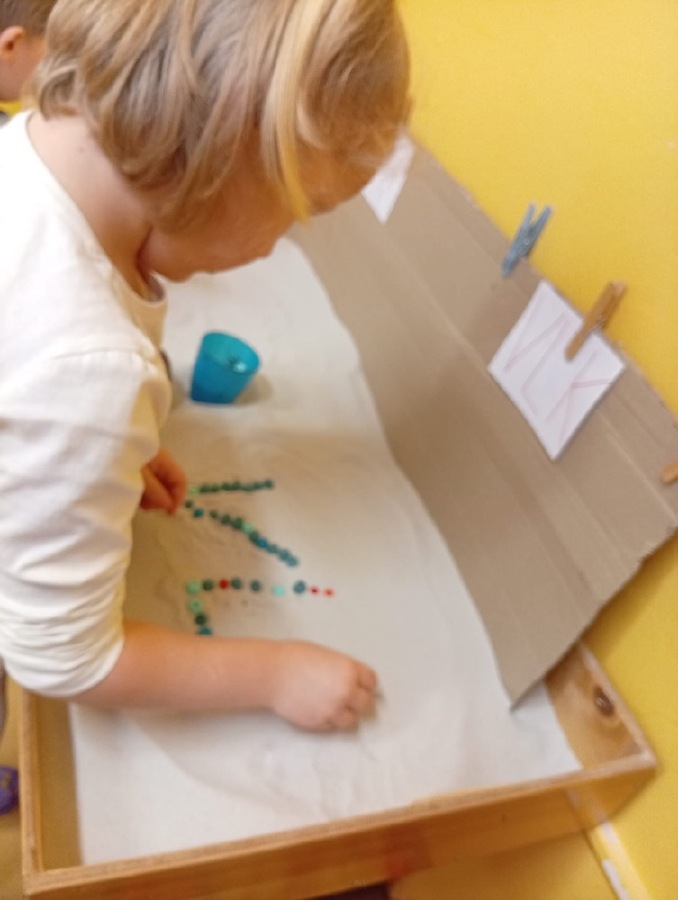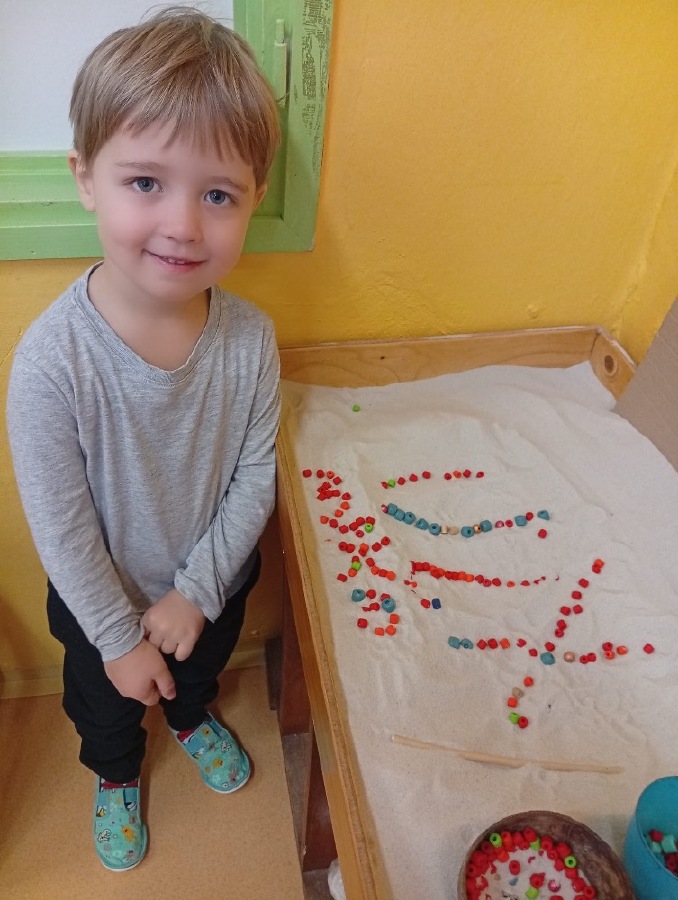 Písek - přepis slova VLK + dozdobení, překresba hrnečku