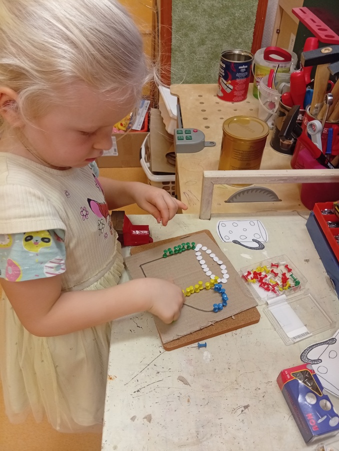 Stolní hry - princezna - navlékání korálků na drát + geom tvary v korunce, dějová posloupnost pohádek + lepení
