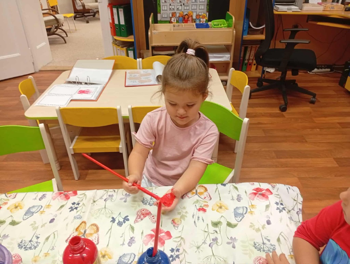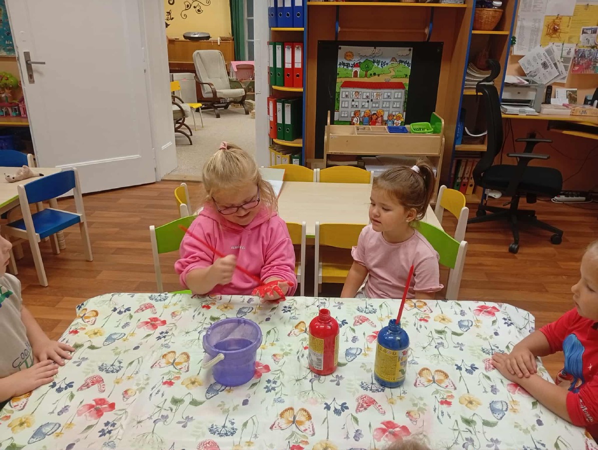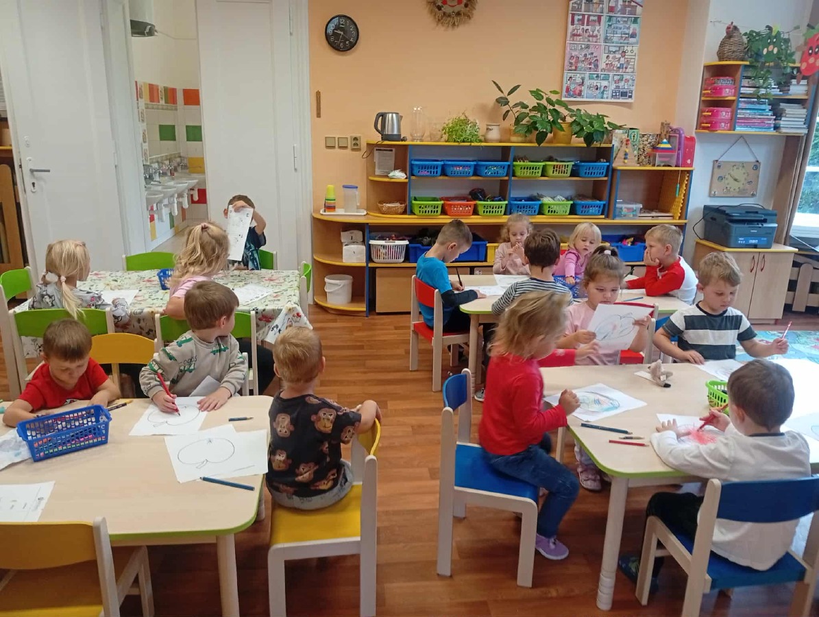 Otisk dlaně do portfolia, vykreslujeme jablíčka. Pracovní listy pro předškoláky - počítáme kamarády a vybarvujeme obrázky podle daného čísla. Sebehodnocení.