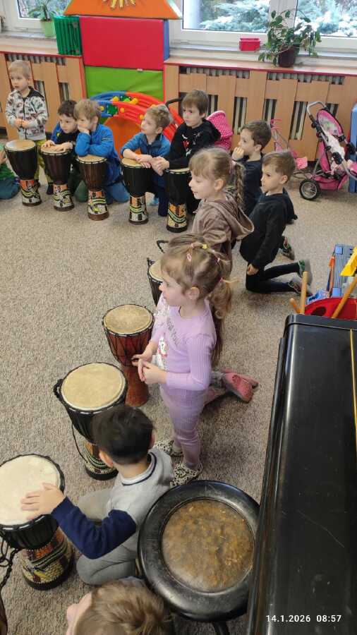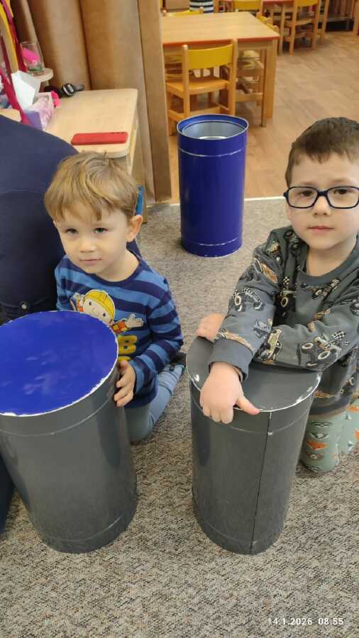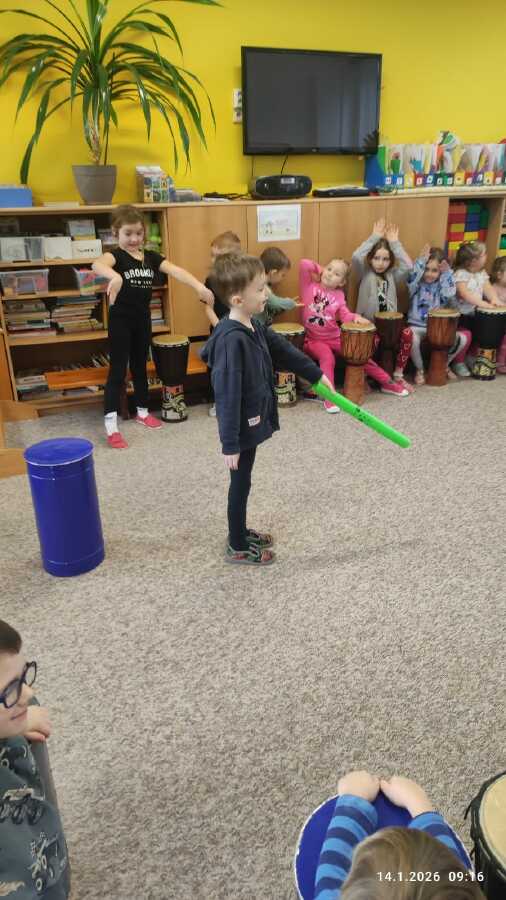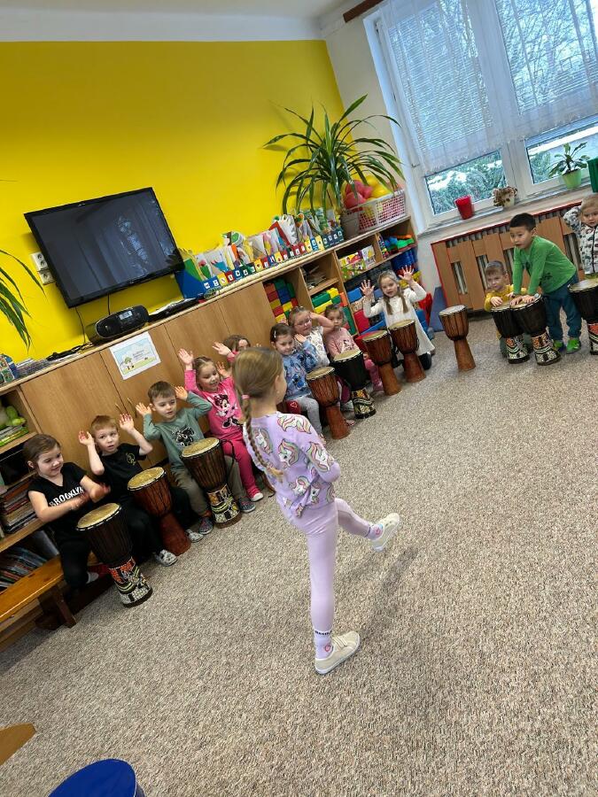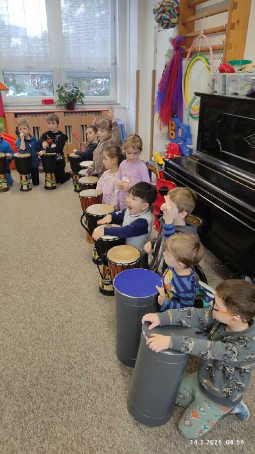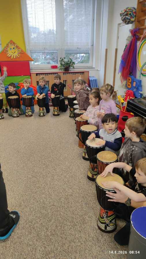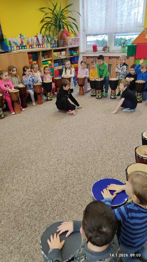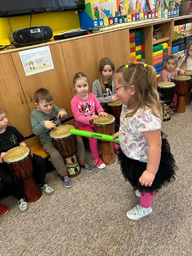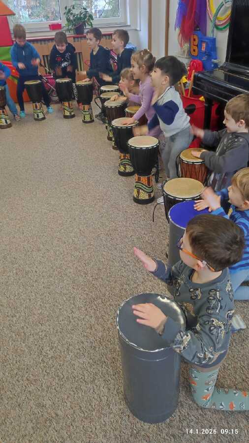 Ve středu si děti z Jablíčka a Hruštičky užily akci Veselé bubnování. Pod vedením pana učitele Suchánka ze ZUŠ Kolín si vyzkoušely, jaká může být s bubny zábava.