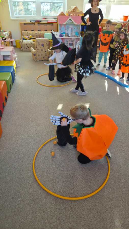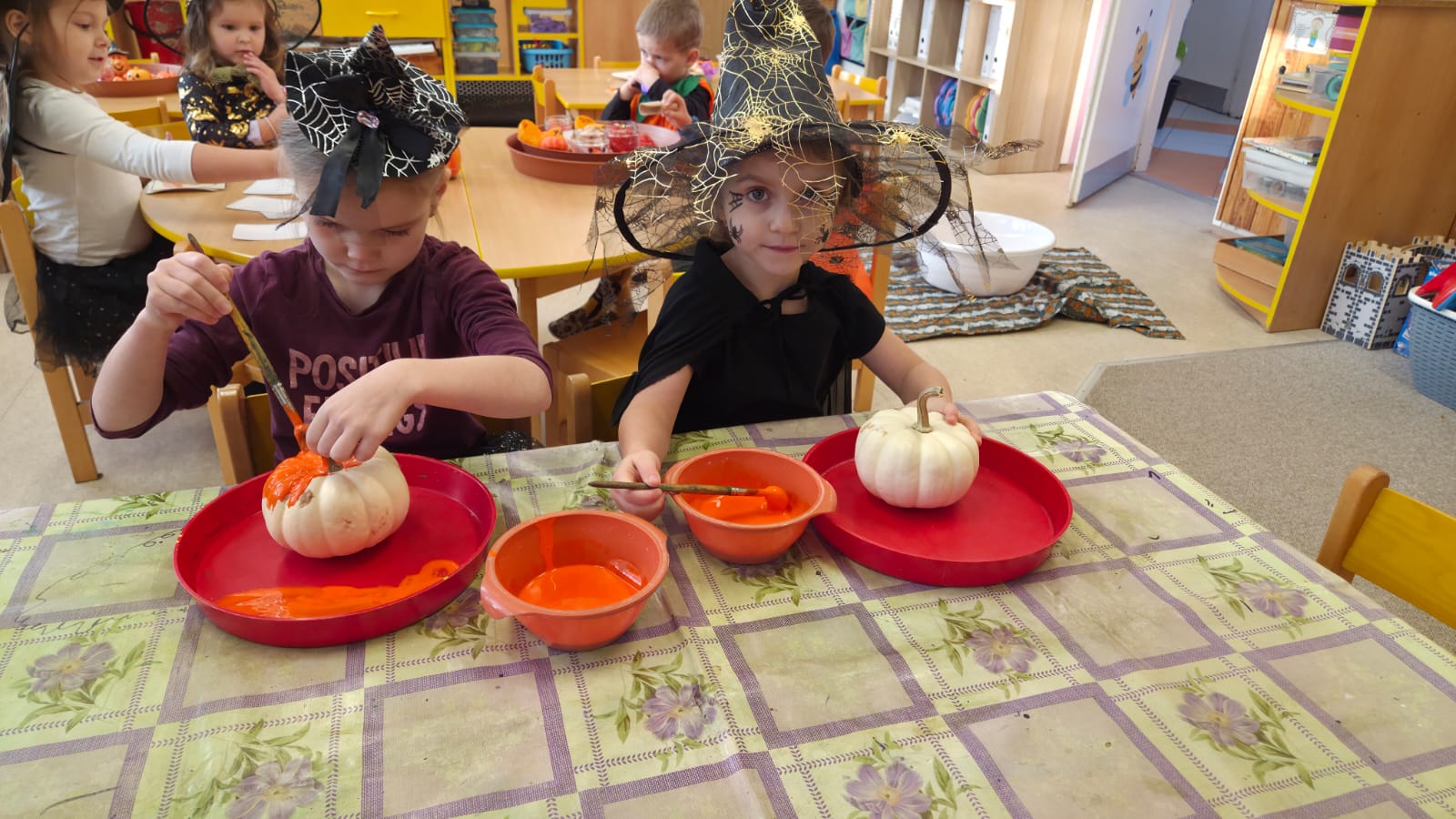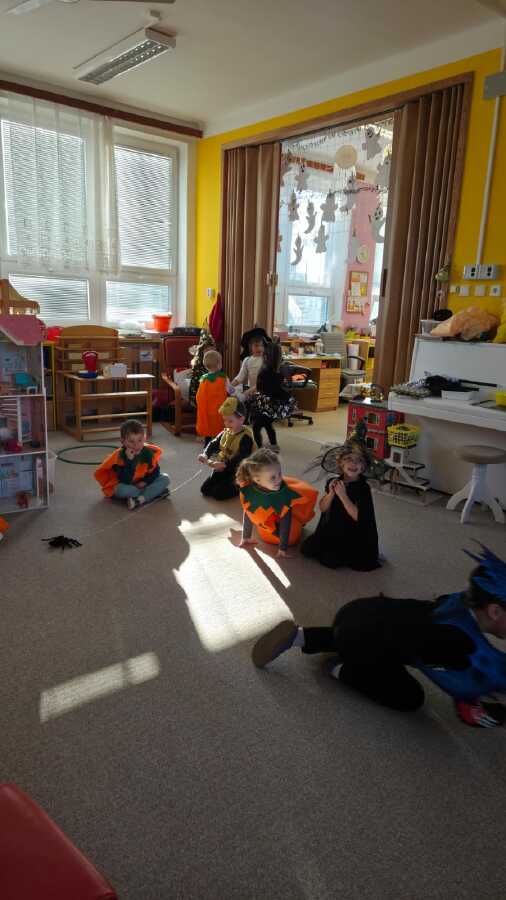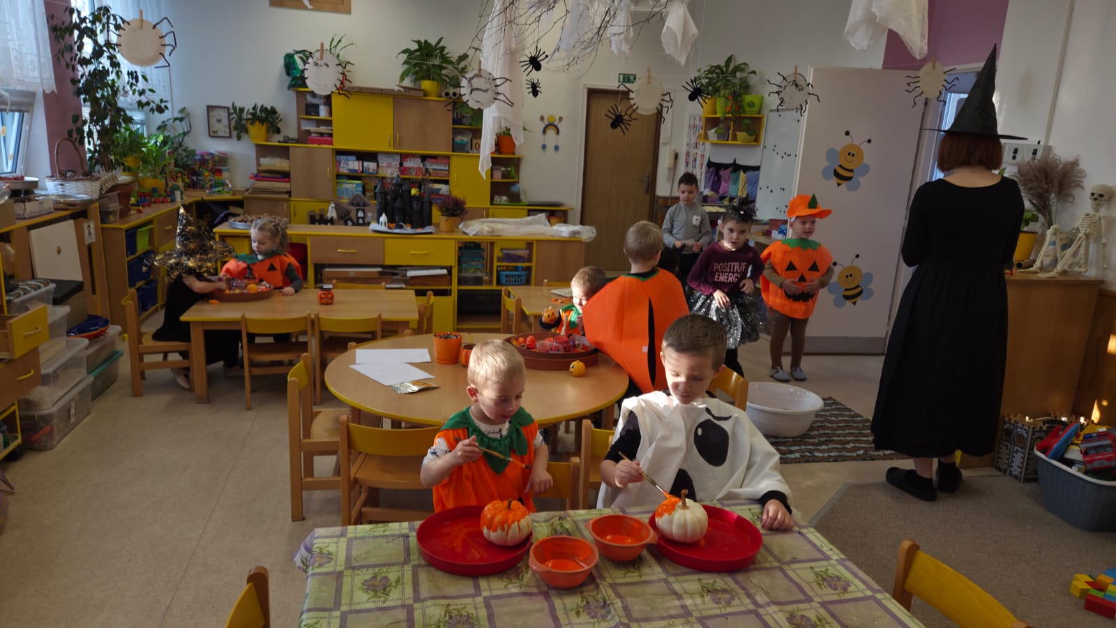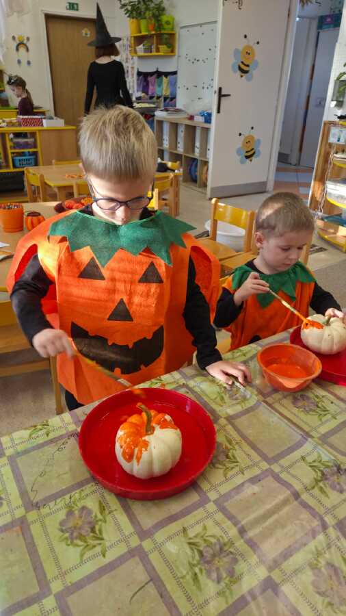 DNEŠNÍ DEN SE TO VE VČELIČKÁCH HEMŽILO DÝNĚMI A HALLOWEENSKÝMI KOSTÝMY. DĚTI SI HRÁLY SE SENZOMOTORICKÝMI TÁCY, HLEDALY, NEBO KRMILY DÝNĚ. TAKÉ DÝNĚ MALOVALY A MYLY DÝNĚ DÝNĚMI VE ŠKOPKU S VODOU