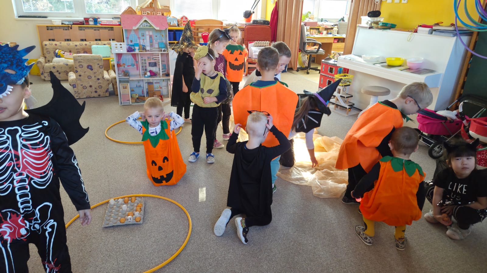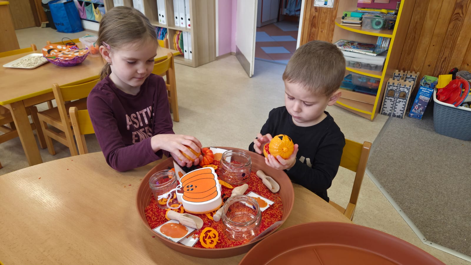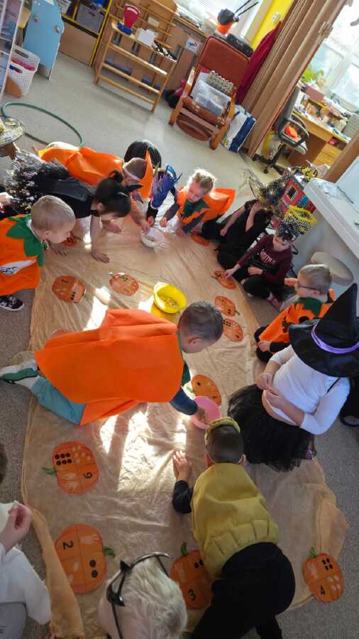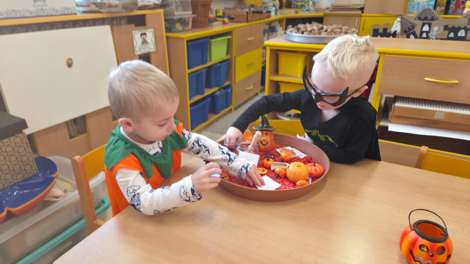 DNEŠNÍ DEN SE TO VE VČELIČKÁCH HEMŽILO DÝNĚMI A HALLOWEENSKÝMI KOSTÝMY. DĚTI SI HRÁLY SE SENZOMOTORICKÝMI TÁCY, HLEDALY, NEBO KRMILY DÝNĚ. TAKÉ DÝNĚ MALOVALY A MYLY DÝNĚ DÝNĚMI VE ŠKOPKU S VODOU
