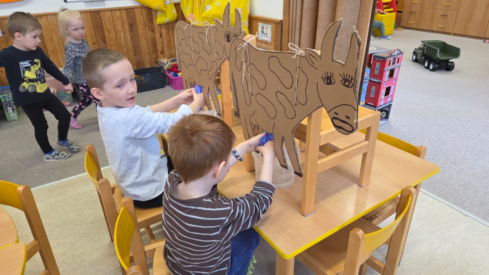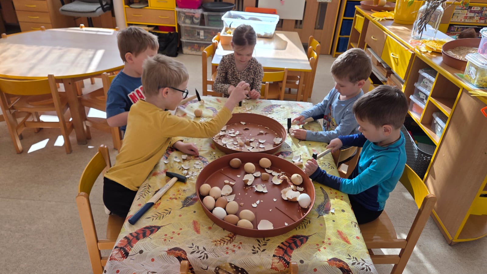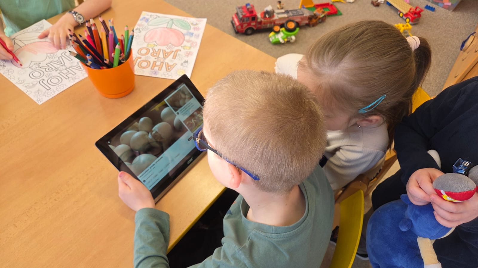 POTOM NA DĚTI ČEKALY DROBNÉ ÚKOLY JAKO POČÍTÁNÍ VAJÍČEK, SESTAVENÍ OBRÁZKŮ Z ČÁSTÍ NEBO VYHLEDÁVÁNÍ GEOMETRICKÝCH TVARŮ A SKVRN NA KRAVIČKÁCH.