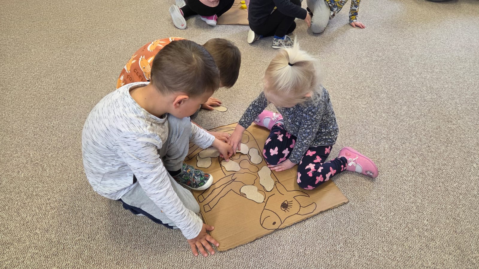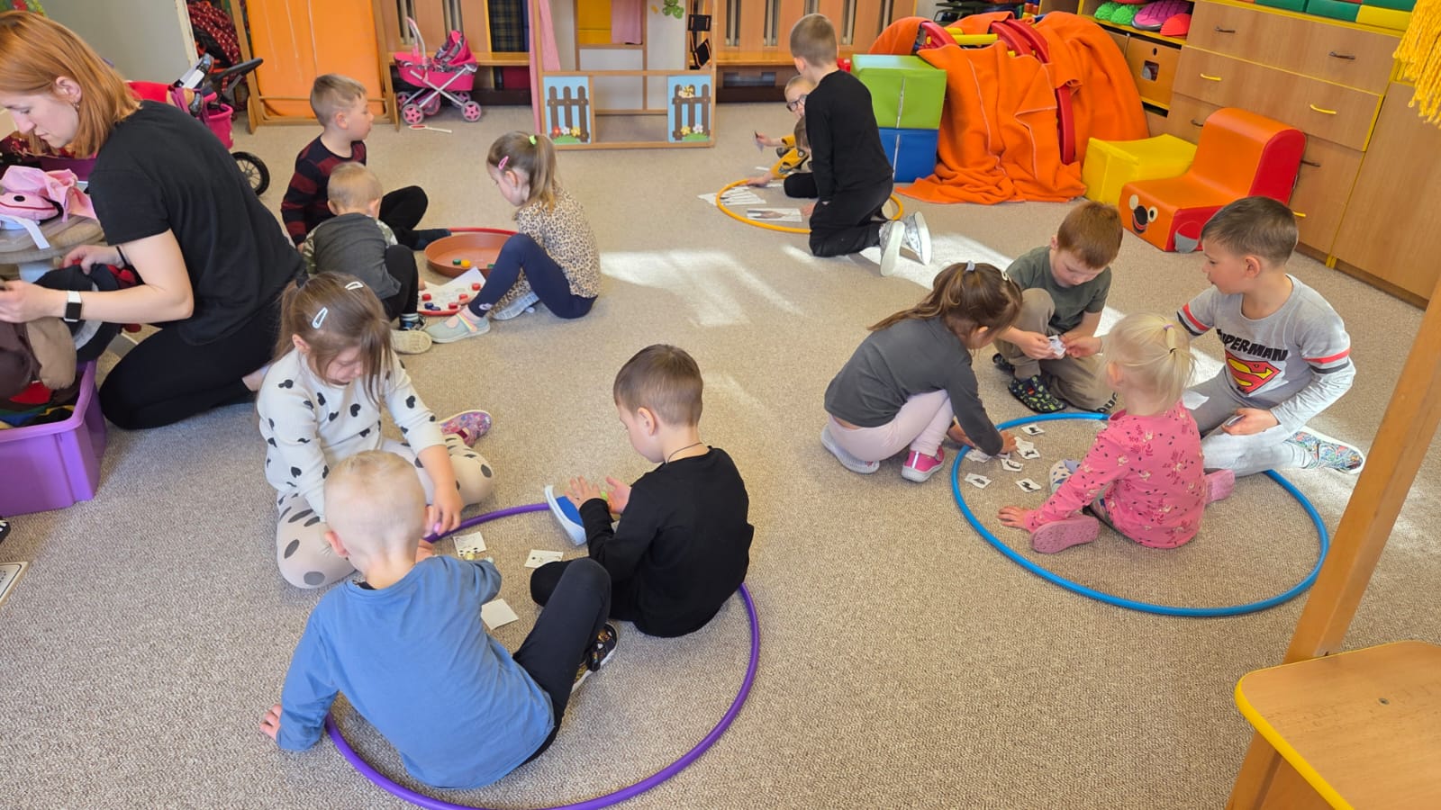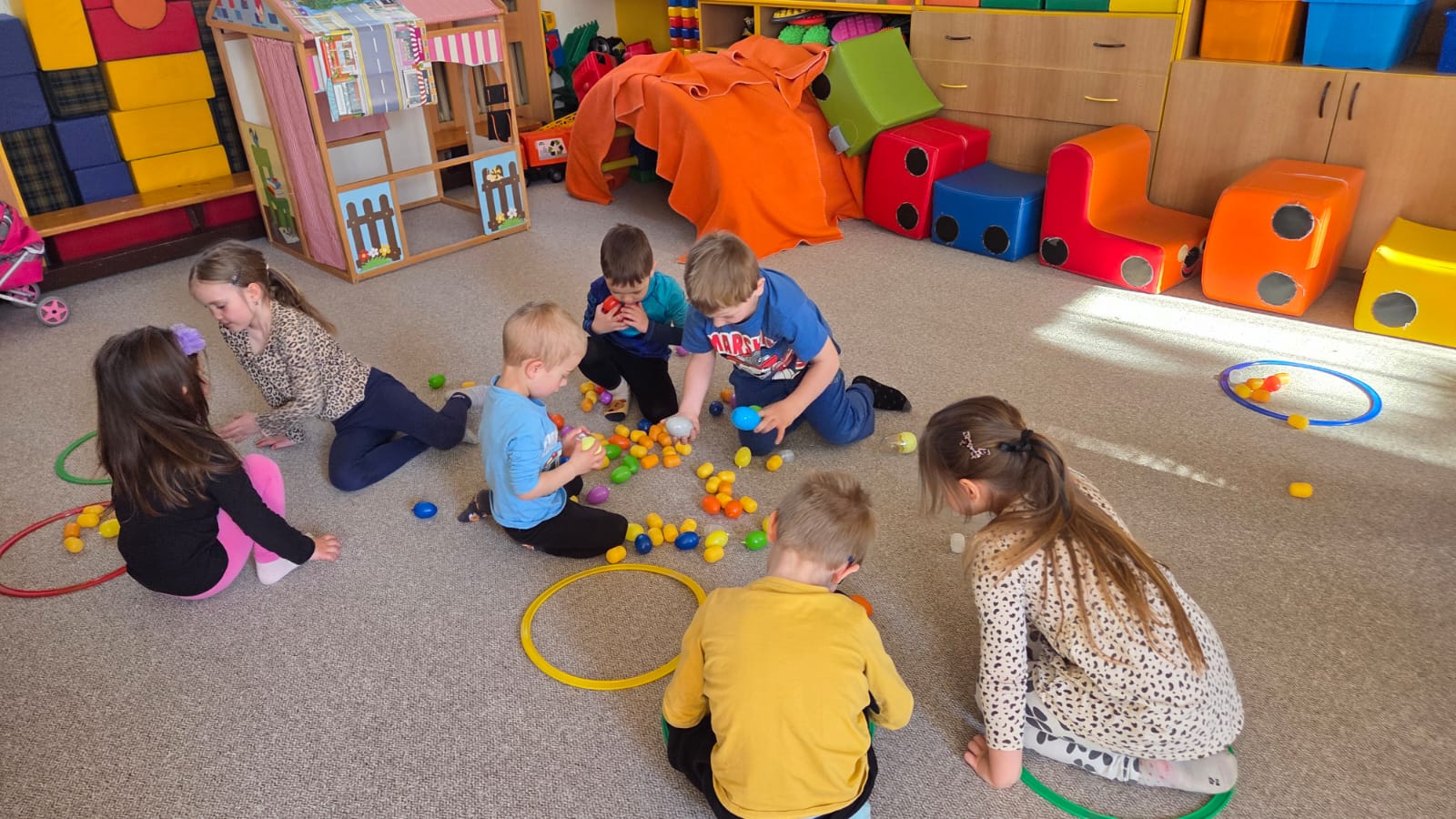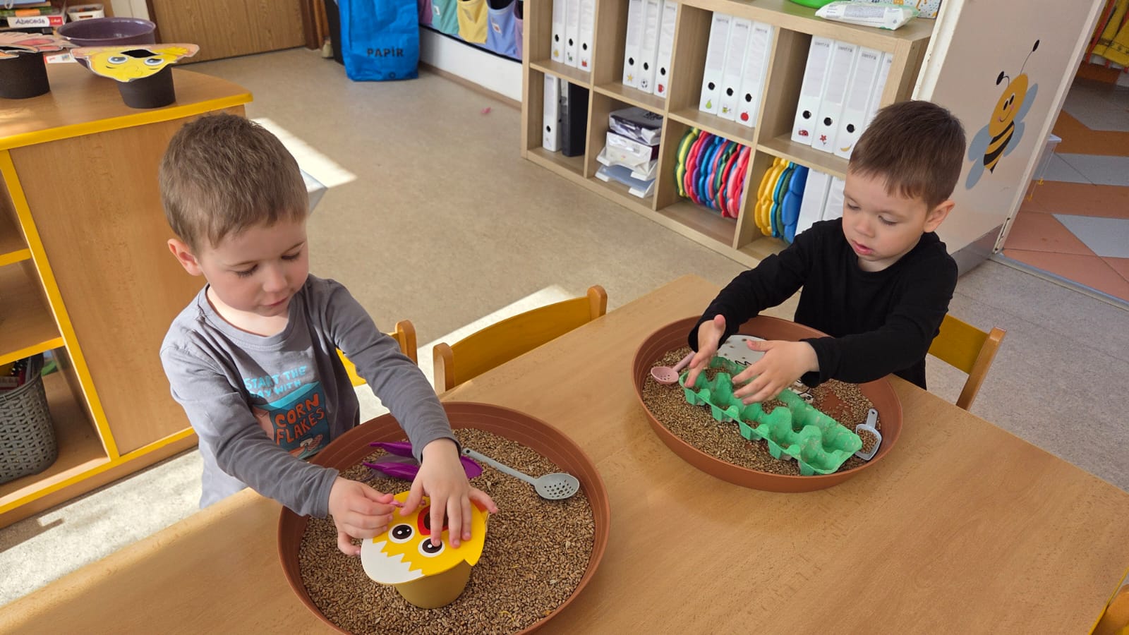 POTOM NA DĚTI ČEKALY DROBNÉ ÚKOLY JAKO POČÍTÁNÍ VAJÍČEK, SESTAVENÍ OBRÁZKŮ Z ČÁSTÍ NEBO VYHLEDÁVÁNÍ GEOMETRICKÝCH TVARŮ A SKVRN NA KRAVIČKÁCH.