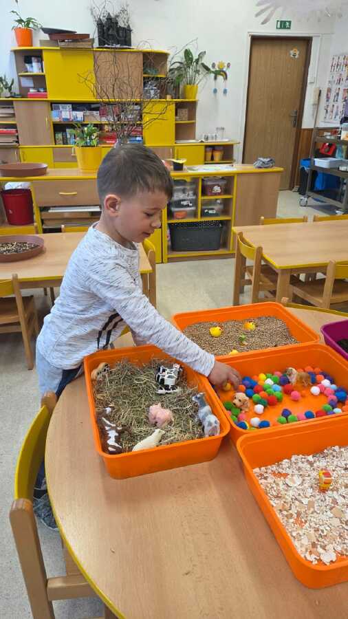 DĚTI SI SAMY PŘIPRAVILY SMYSLOVÝ TÁC, KDE MĚLY FARMU, ZVÍŘÁTKA, ALE I TRAKTORY, SENO PRO KONÍKY, BLÁTIVOU LOUŽI PRO PRASÁTKY NEBO OHRÁDKY A CHLÍVEČKY PRO DOMÁCÍ A HOSPODÁŘSKÁ ZVÍŘÁTKA A JEJICH MLÁĎÁTKA.