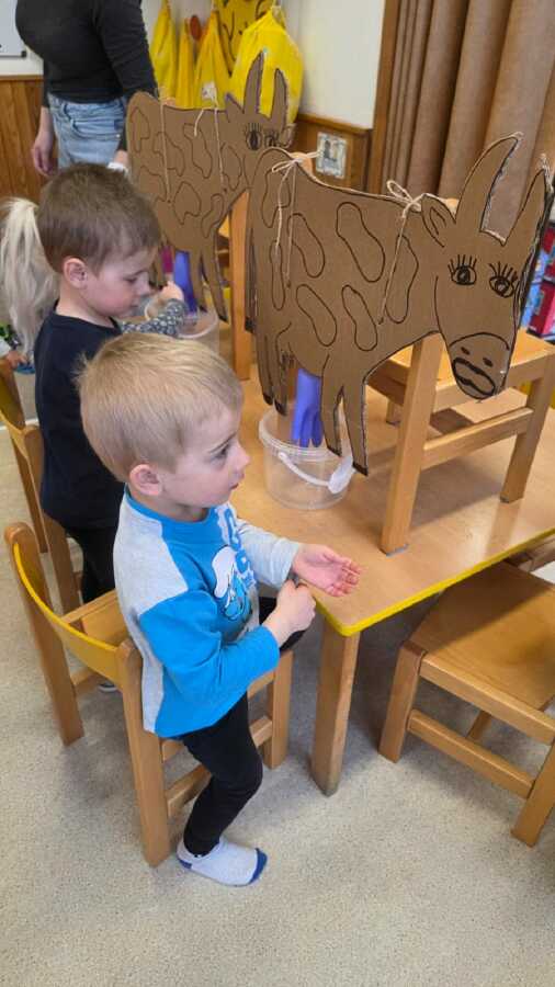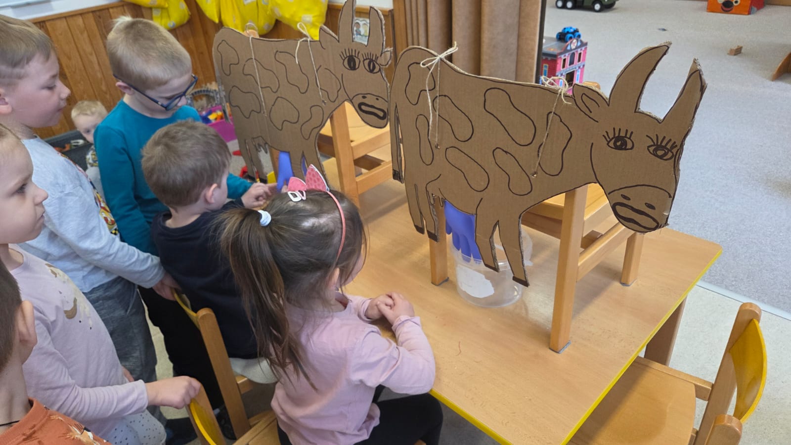V PÁTEK UŽ NA DĚTI ČEKALO MALÉ PŘEKVAPENÍ, A TO DOJENÍ KRAVIČKY A SMYSLOVÝ CHODNÍČEK Z NAŠÍ FARMIČKY. JEDNOTLIVÉ ČÁSTI CHODNÍČKU SI DĚTI POJMENOVALY PODLE POUŽITÉHO MATERIÁLU. TAK NAPŘÍKLAD, SENO JAKO PODESTÝLKA PRO ZVÍŘÁTKA,