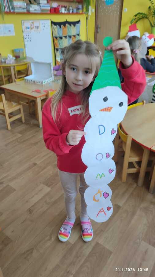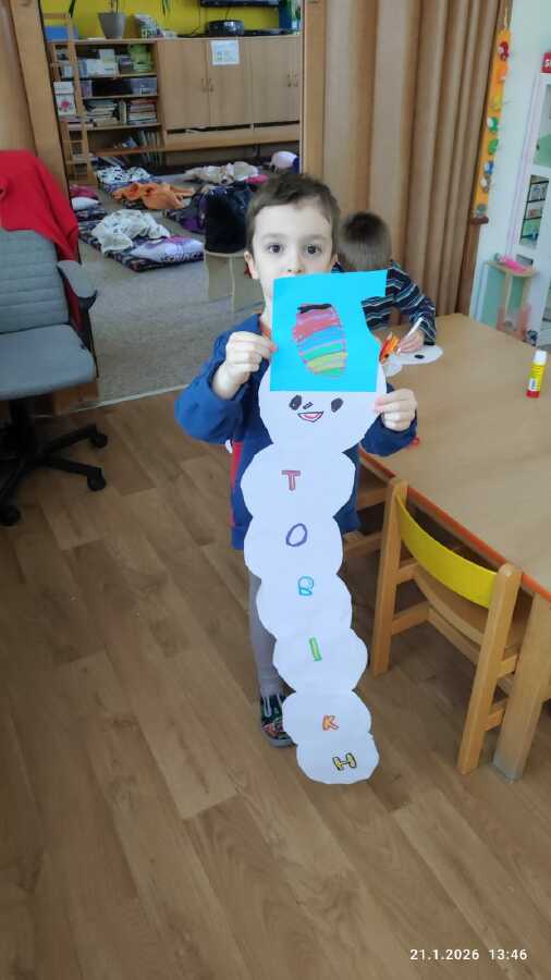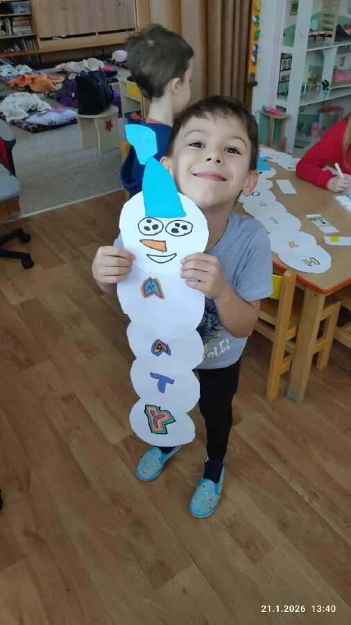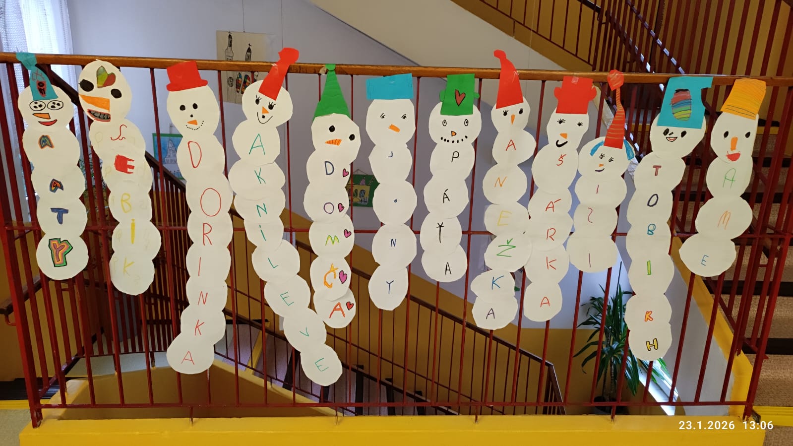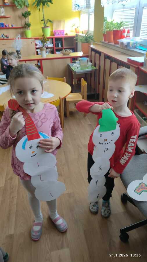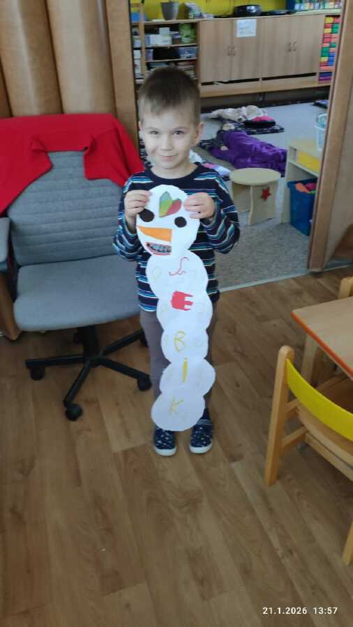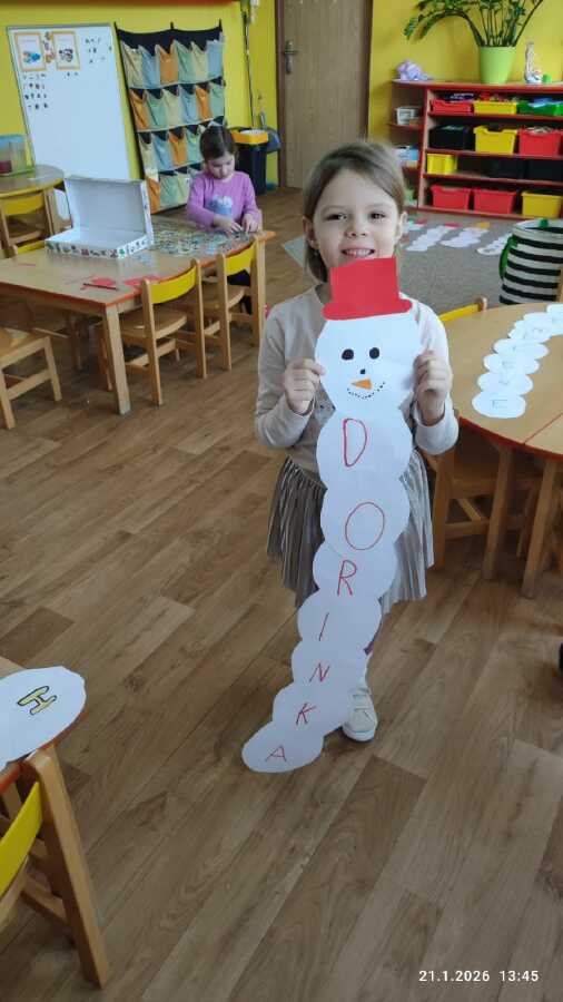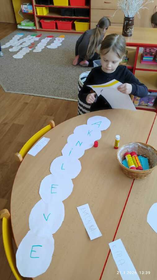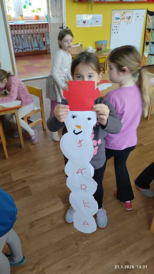 Předškolní děti si opakovaly, kde je vpravo,vlevo, nahoře,dole. Musely správně spočítat z kolika písmenek se skládá jejich jméno a "postavit" svého jmenovce sněhuláka.