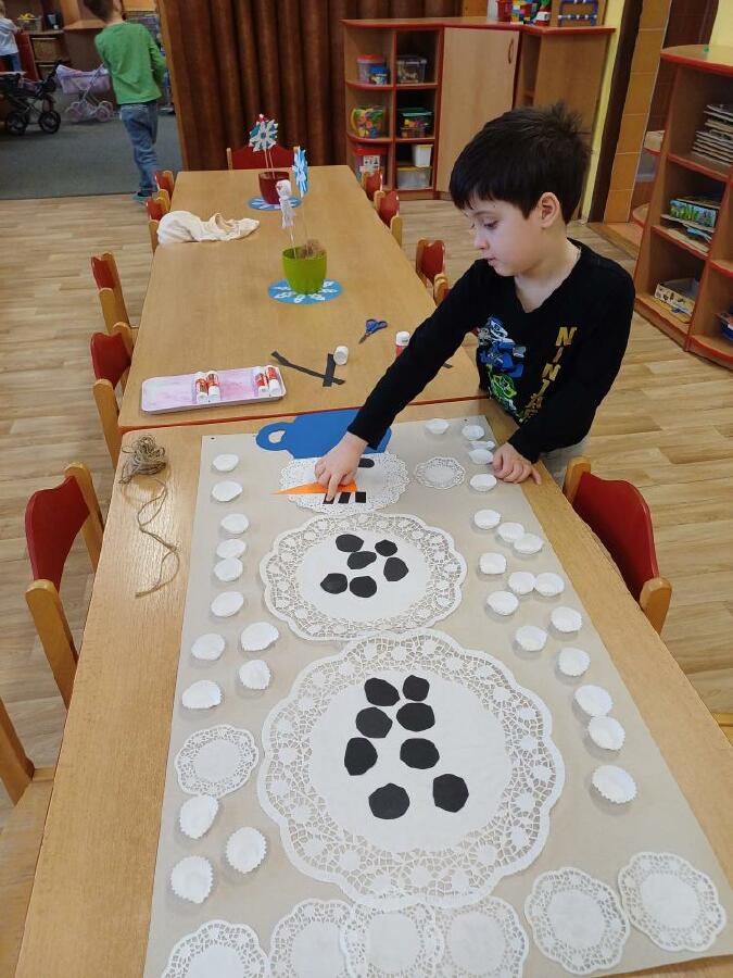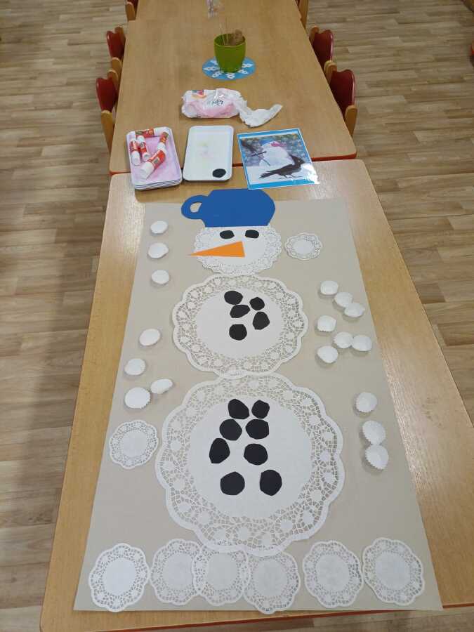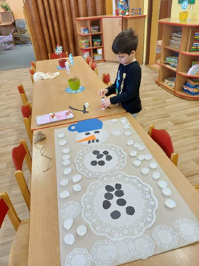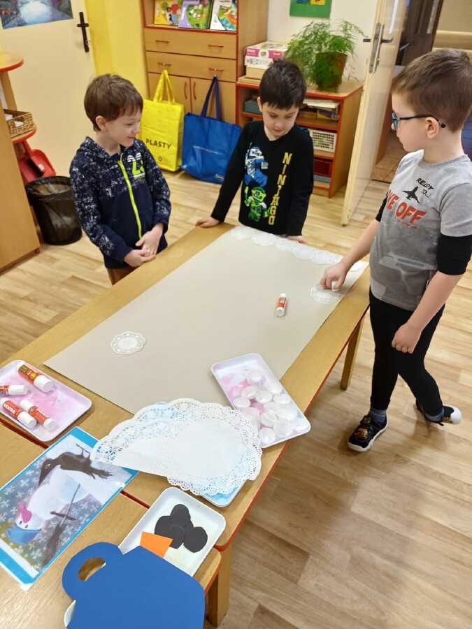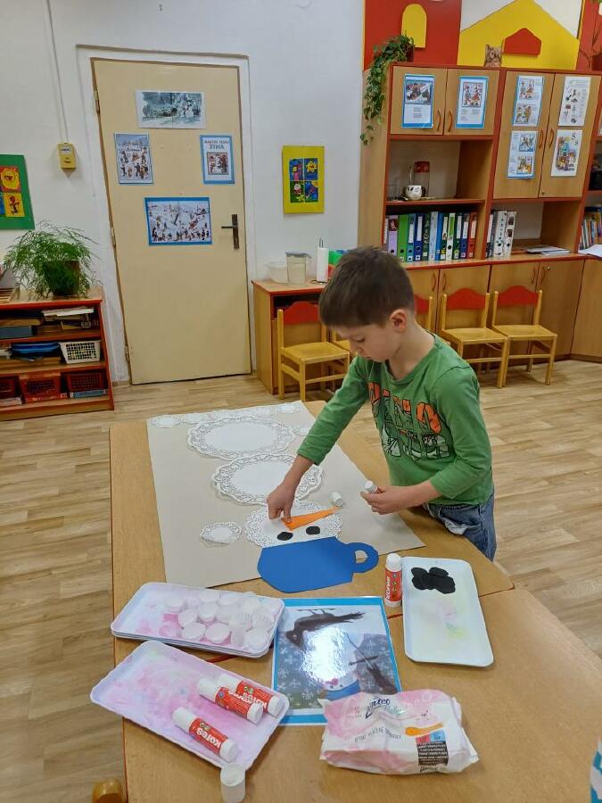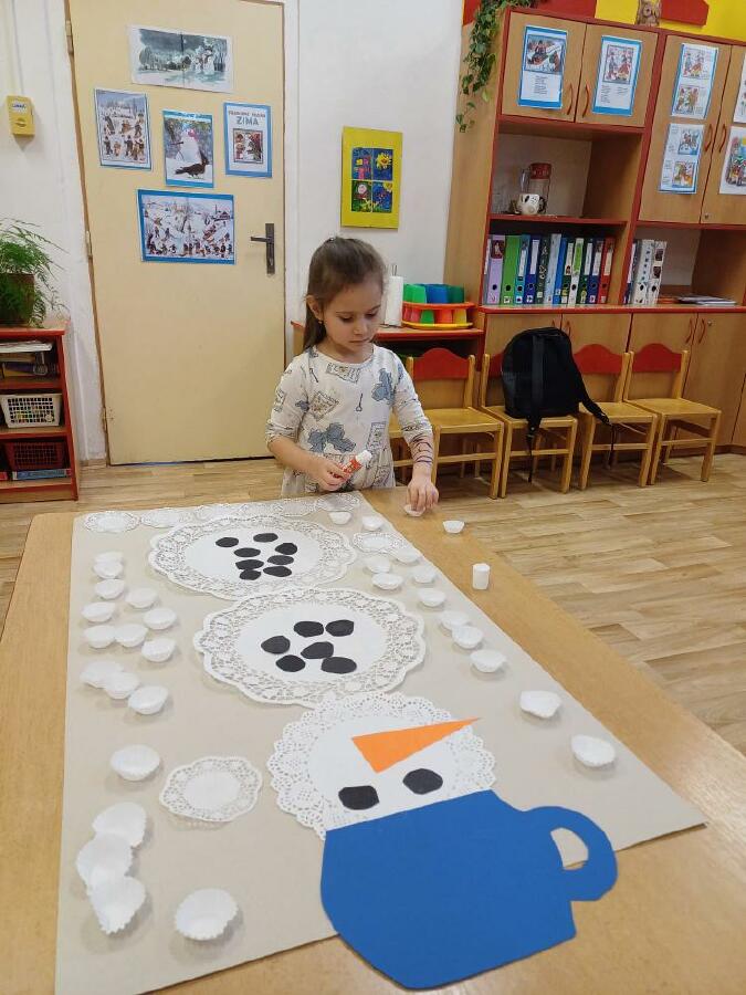 Sněhuláci-sníh-led.Společná práce,sestavování a lepení na plošeA1.Rytmizace písně - "Sněhuláčku,sněhuláčku,sněhuláčku,stojíš u nás na dvorečku"ČERVENÁ KYTIČKA.