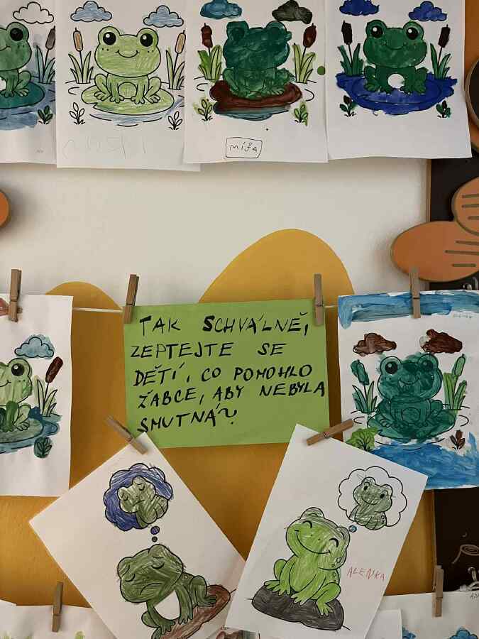 Aktivity celého společného týdne, kdy nám Medovníček představil knížku Úsměv pro žabku. Po přečtení knížky, jsme zjistili, co samotnou žabku rozveselí. Žabky jsme vytvořili z papíru, předškoláci úplně celou samostatně a menším dětem se taky velmi dařilo, trhaly a lepily papír a podařilo se i díky pozorování žabek, (obrázky :-)) nalepit oči na správné místo. Sluchem jsme poznávali, které kamínky, se kterými se žabka hraje, patří k sobě (sluchové pexeso) a zahráli jsme si hudební hru s dešťovou písničkou. Cvičili jsme s lekníny, vybarvovali a přiřazovali zvířátka ve dne a jejich stíny v noci. Předškoláci si vyzkoušeli vybarvování podle bodů nebo zrakem najít žabku schovanou v čarách a taky předložkový diktát s žabkami. Všechny bavila grafomotorika, kdy jsme z velkých kruhů vytvořili žábu. A co že žabku rozveselilo? Zeptejte se dětí, schválně, jestli si to zapamatovaly.
