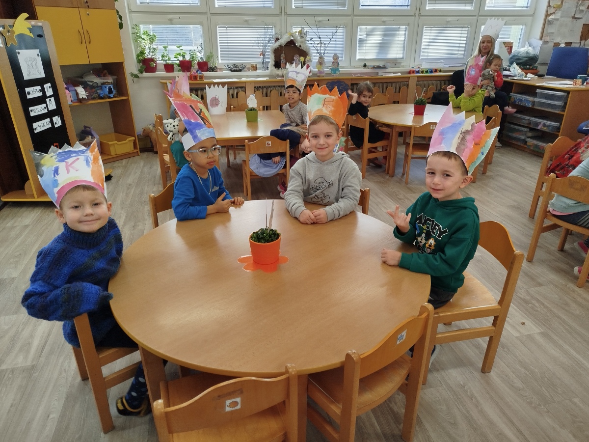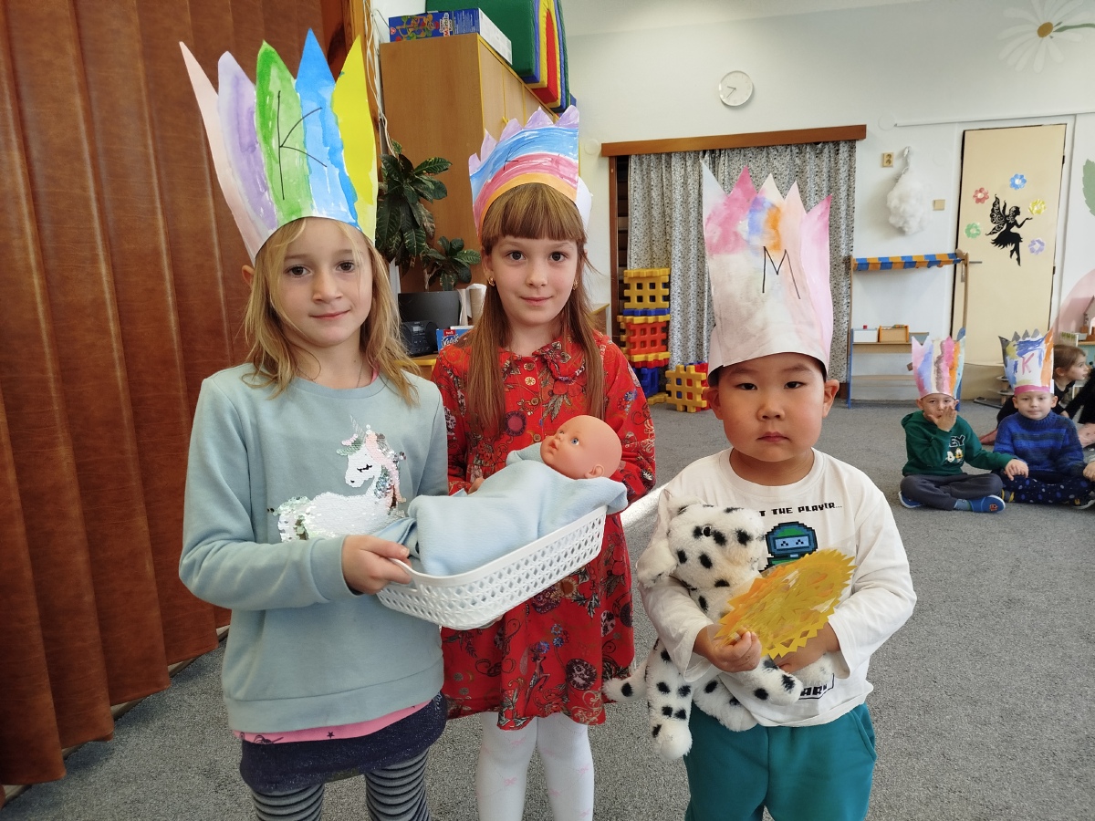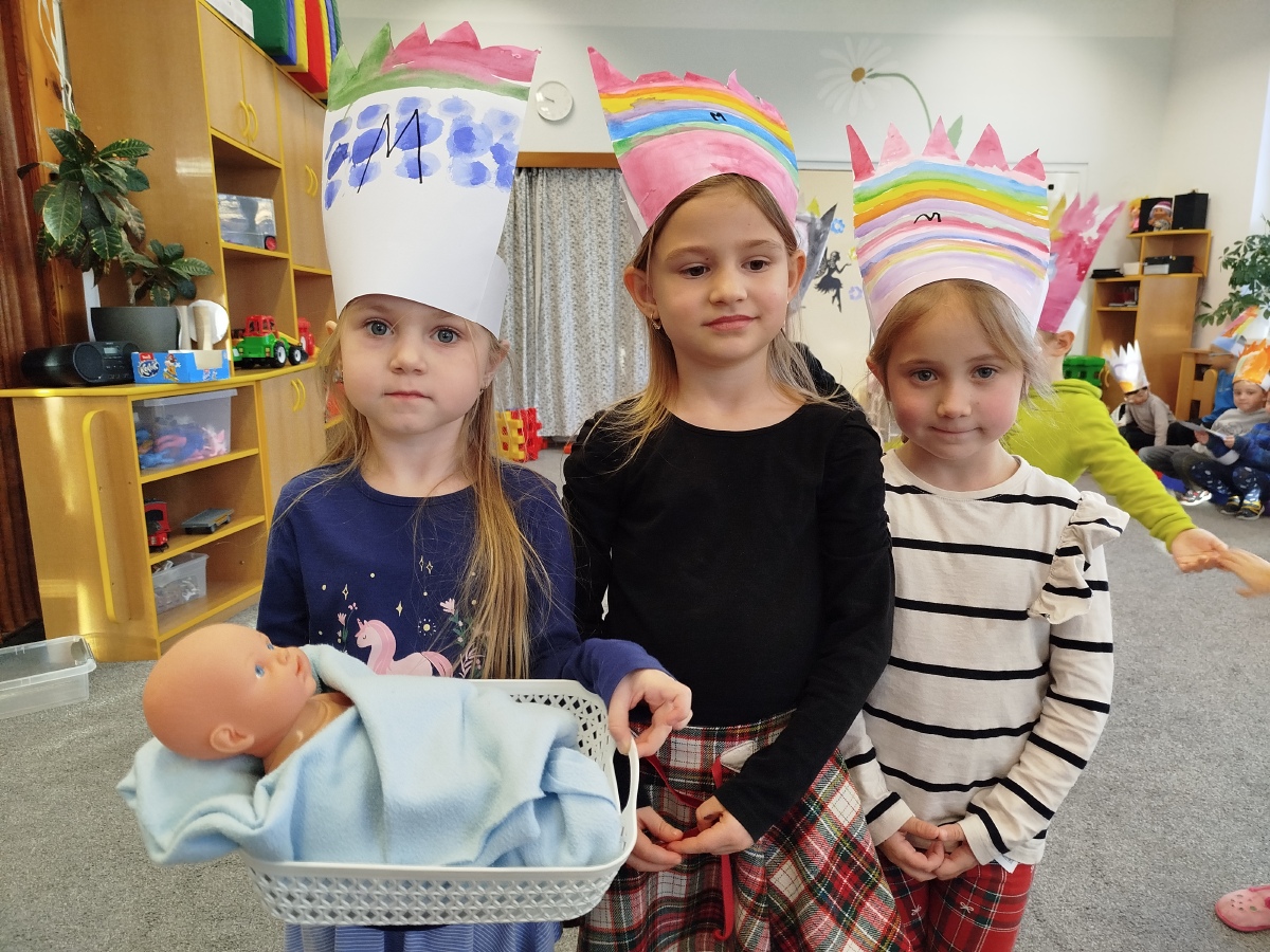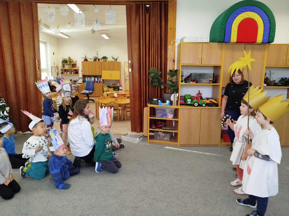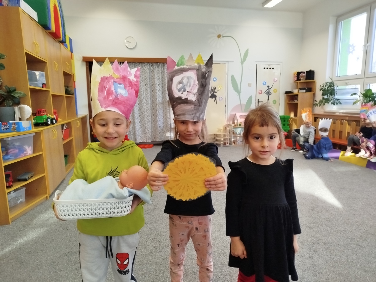 Dnes k nám do Žluté kytičky přišli na návštěvu Tři králové z Červené kytičky. My jsme si ráno vyrobili královské koruny a zahráli si na Tři krále a putovali za Ježíškem. Museli jsme sledovat cestu podle vloček k Ježíškovi a procvičili si chůzi ve trojicích.Nakonec jsme si naposledy zazpívali koledy a tím jsme ukončili vánoční čas. Hodně štěstí a zdraví v novém roce!