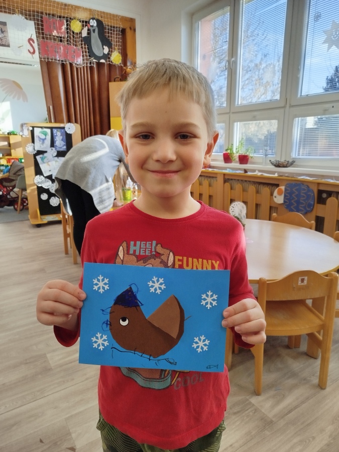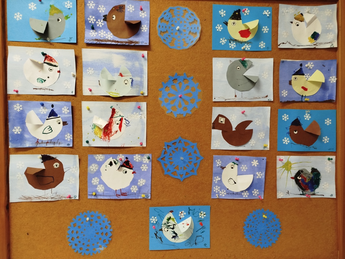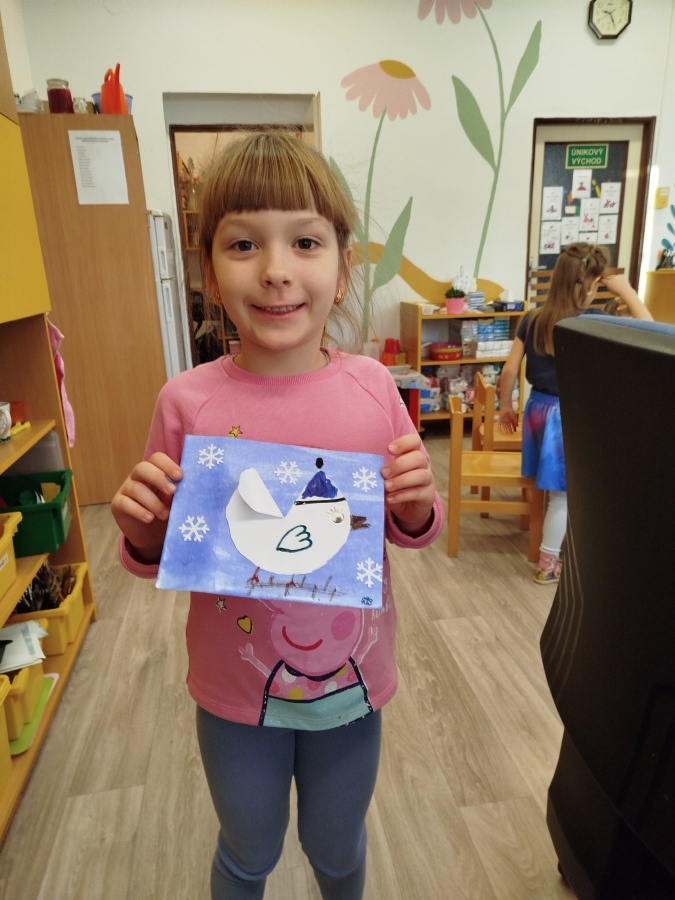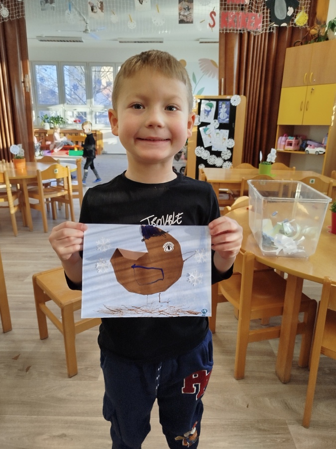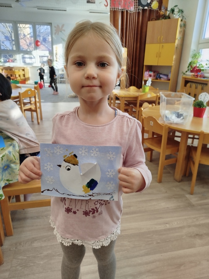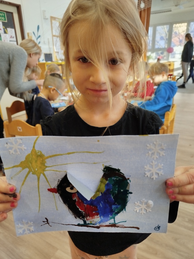 My Žluťáskové máme ve školce na zahradě svůj ptačí strom. Je na něm ptačí budka a krmítko. Teď v zimě každý den krmíme ptáčky slunečnicovými semínky. A protože máme ptáčky rádi a líbí se nám, vytvořili jsme obrázky ptáčka v zimě :))