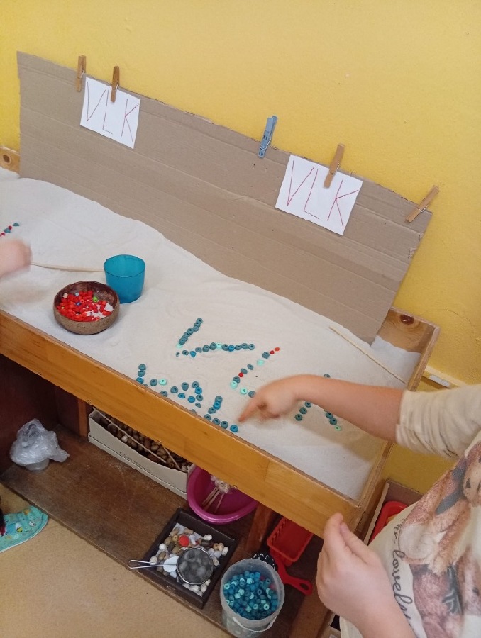 Písek - přepis slova VLK + dozdobení, překresba hrnečku