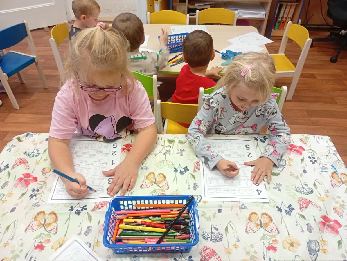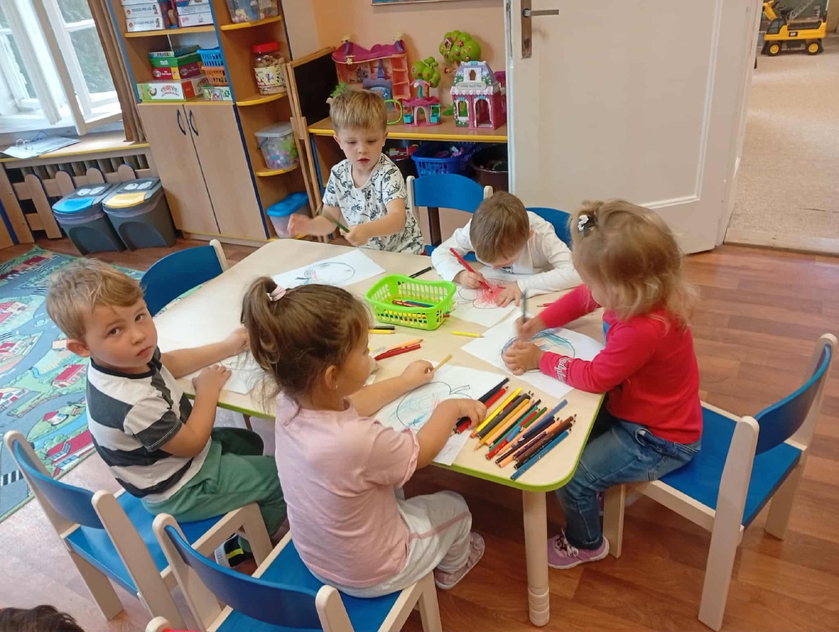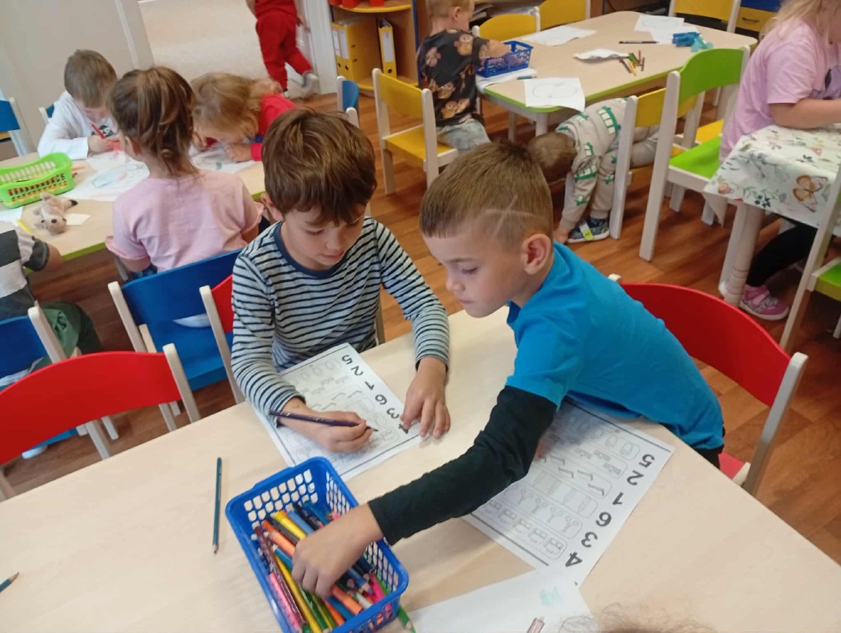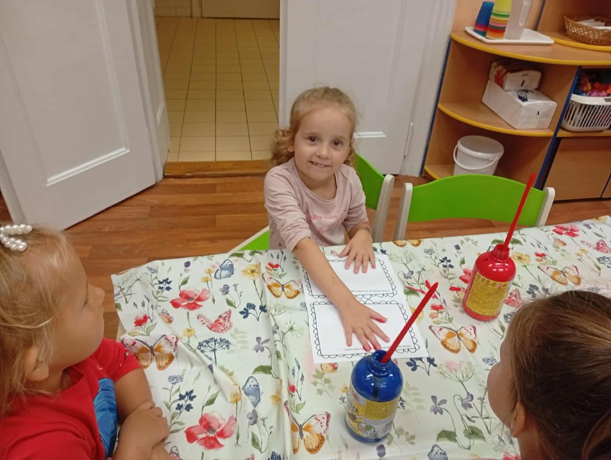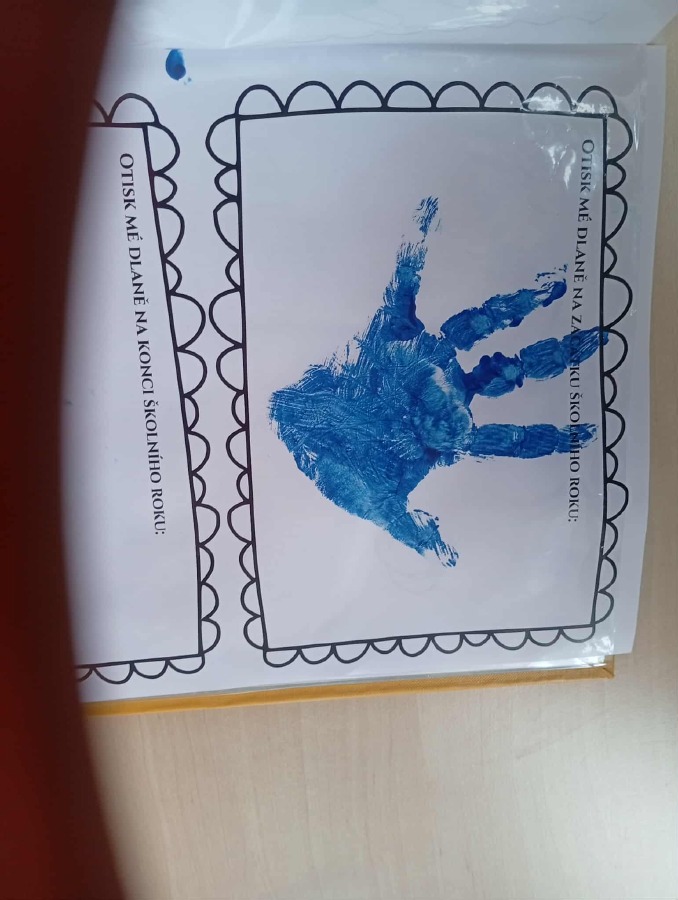 Otisk dlaně do portfolia, vykreslujeme jablíčka. Pracovní listy pro předškoláky - počítáme kamarády a vybarvujeme obrázky podle daného čísla. Sebehodnocení.