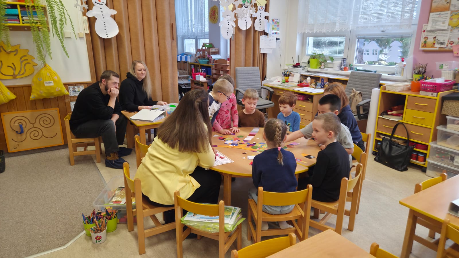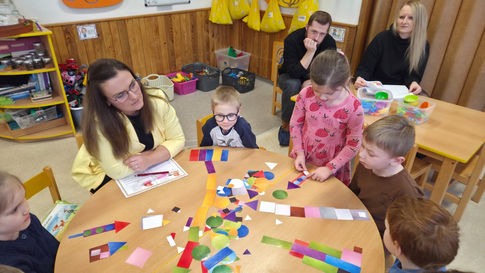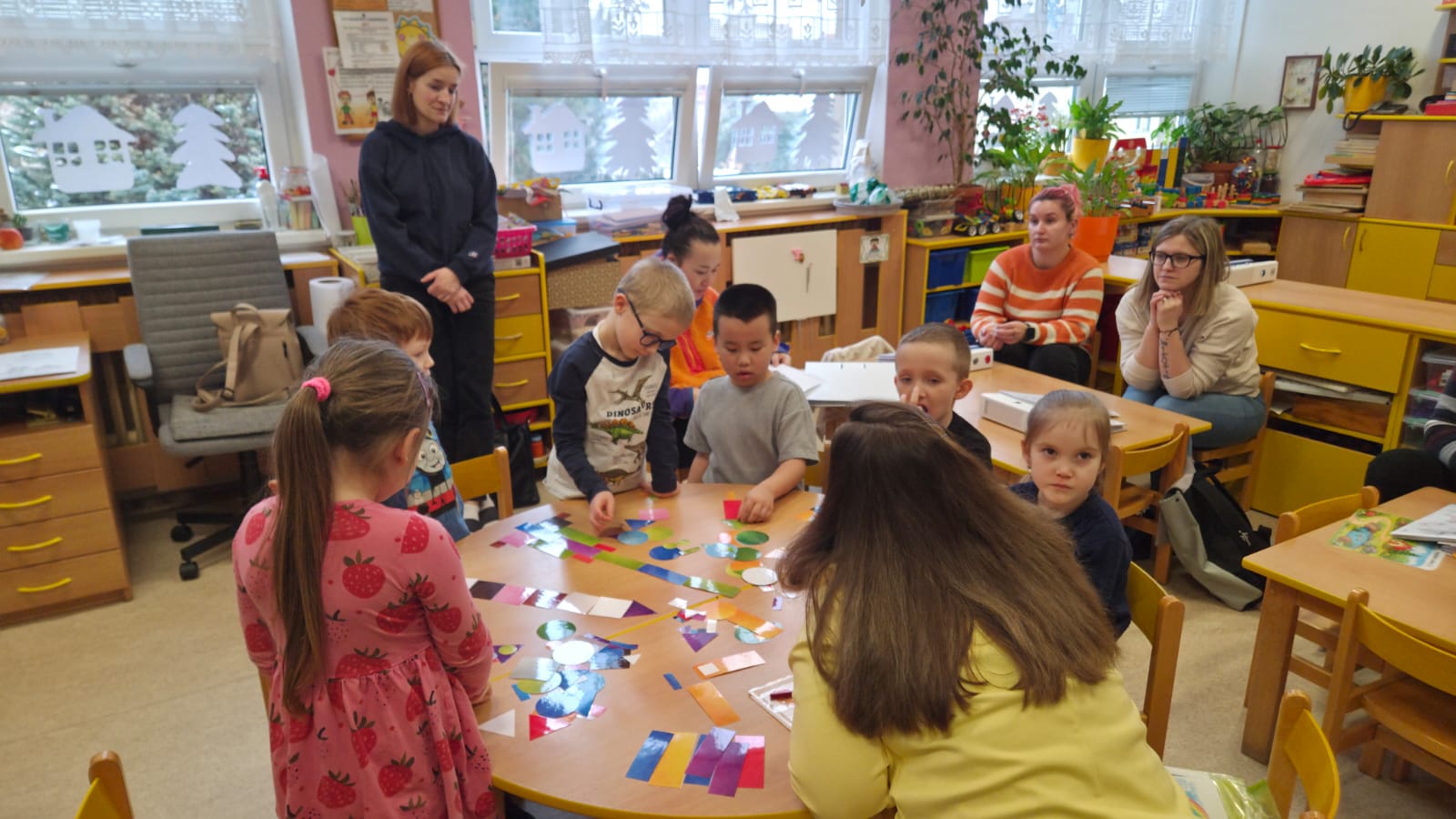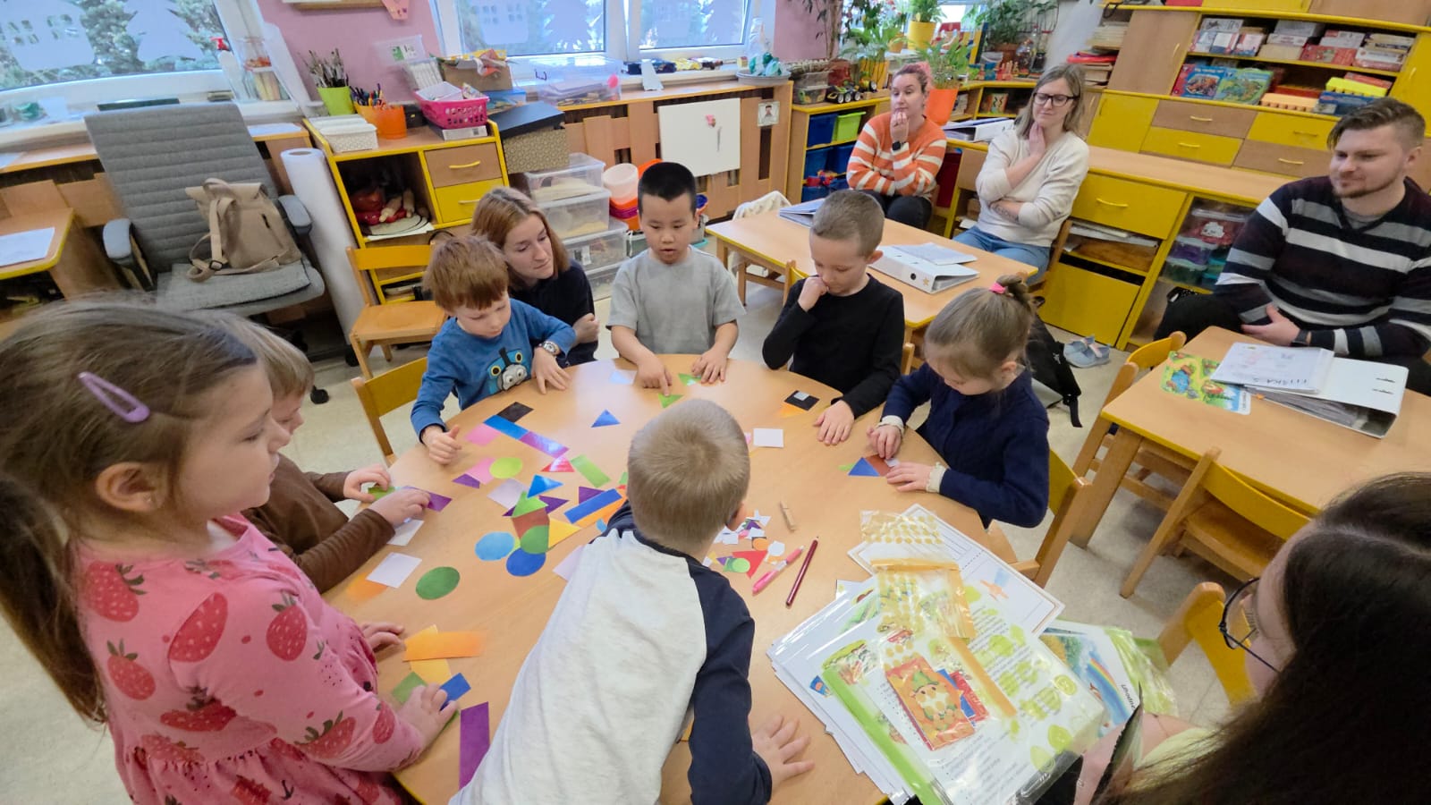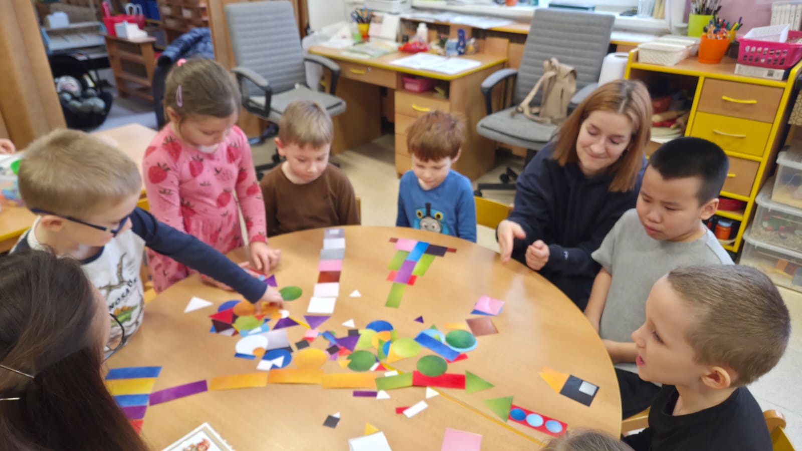 DĚTI SI PROCVIČILY PROSTOROVOU I PRAVOLEVOU ORIENTACI,KRESLILY POSTAVU, VYHLEDÁVALY STEJNÉ GEOMETRICKÉ TVARY NEBO ŘÍDILY PŘEDMĚTY PODLE BAREV.