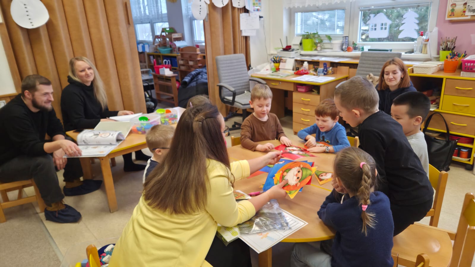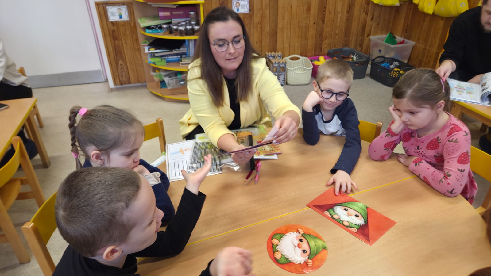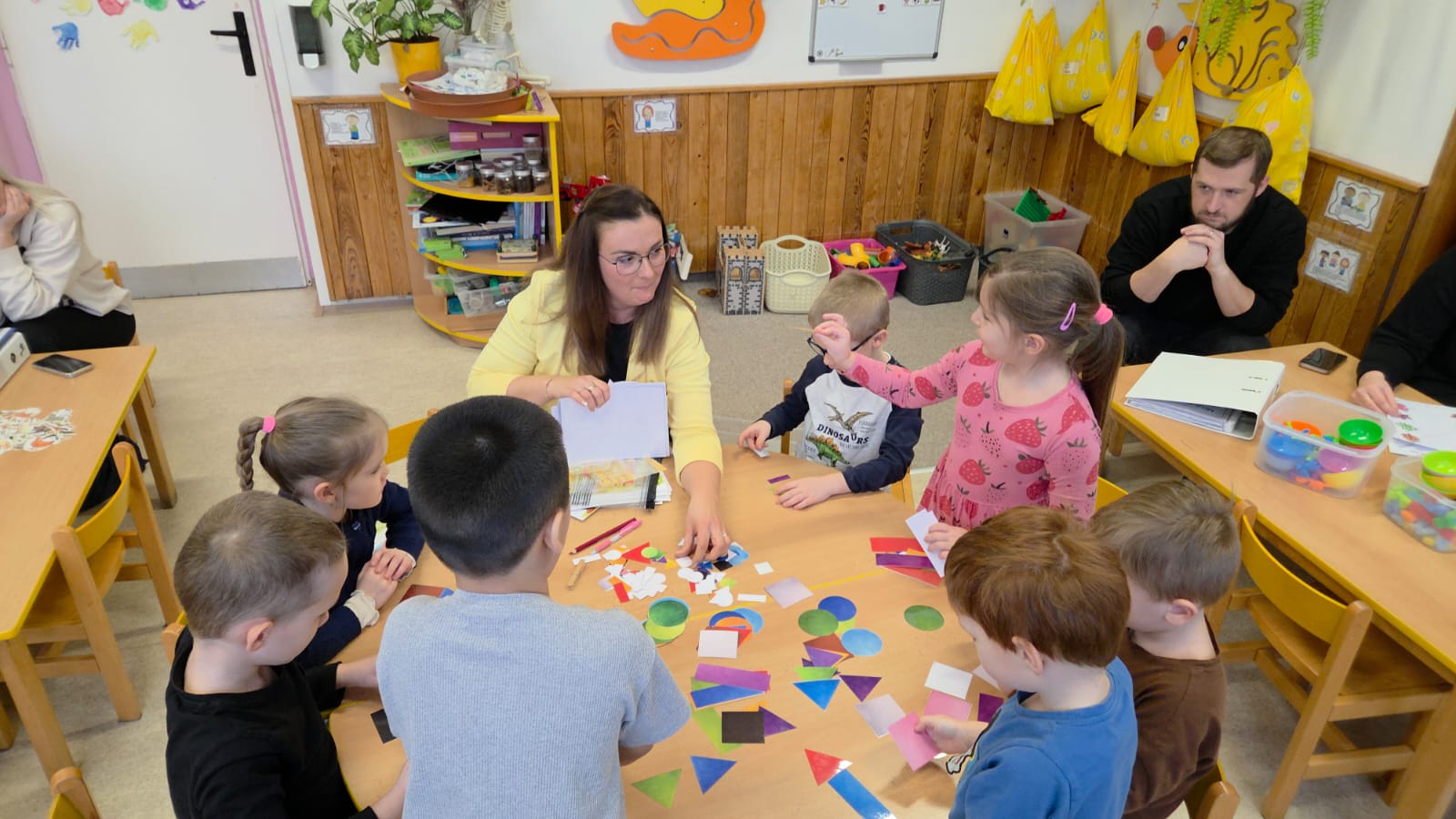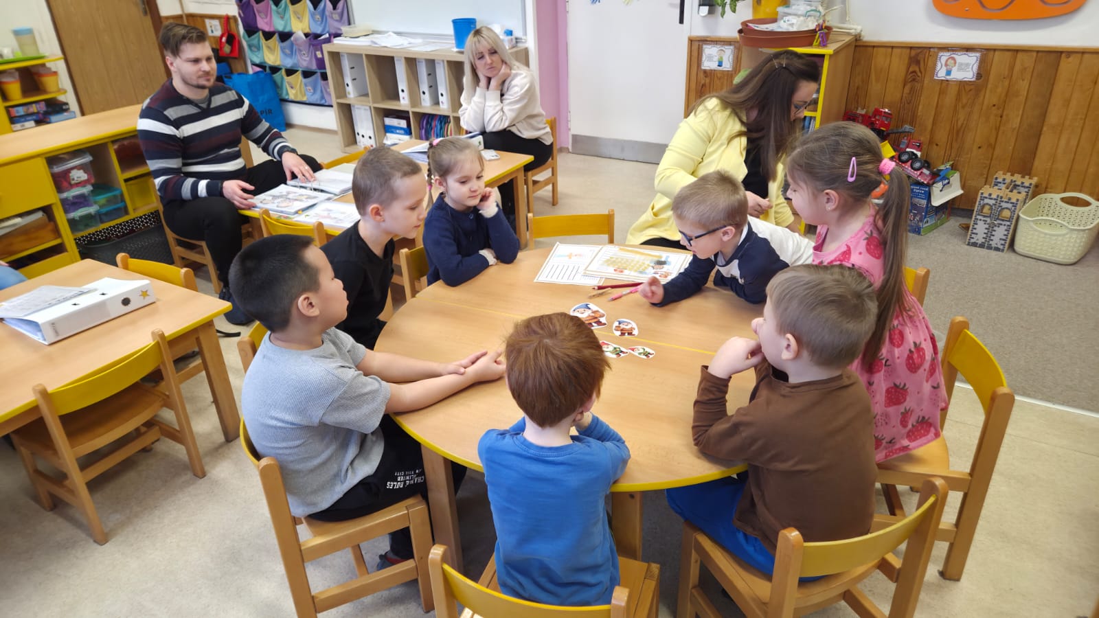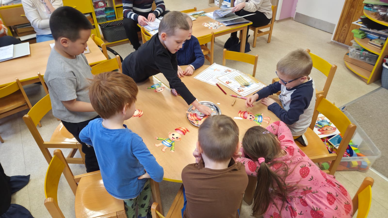 DĚTI SI PROCVIČILY PROSTOROVOU I PRAVOLEVOU ORIENTACI,KRESLILY POSTAVU, VYHLEDÁVALY STEJNÉ GEOMETRICKÉ TVARY NEBO ŘÍDILY PŘEDMĚTY PODLE BAREV.