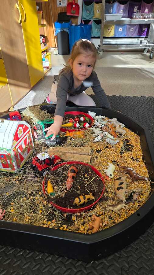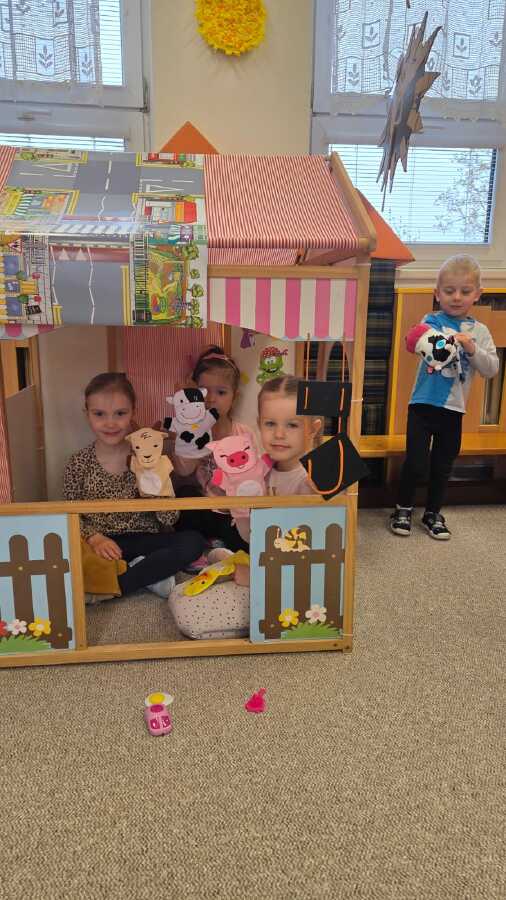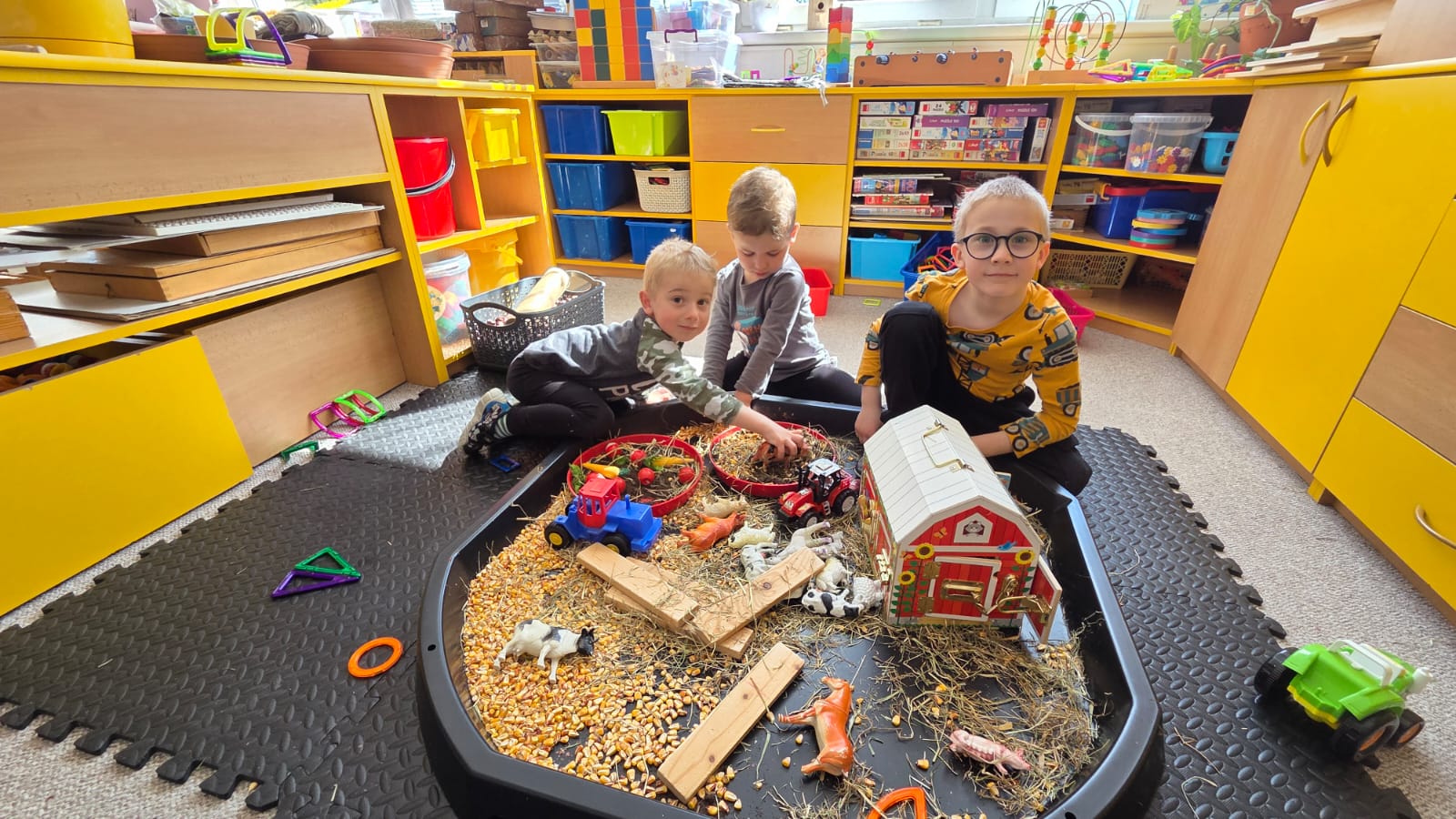DĚTI SI SAMY PŘIPRAVILY SMYSLOVÝ TÁC, KDE MĚLY FARMU, ZVÍŘÁTKA, ALE I TRAKTORY, SENO PRO KONÍKY, BLÁTIVOU LOUŽI PRO PRASÁTKY NEBO OHRÁDKY A CHLÍVEČKY PRO DOMÁCÍ A HOSPODÁŘSKÁ ZVÍŘÁTKA A JEJICH MLÁĎÁTKA.