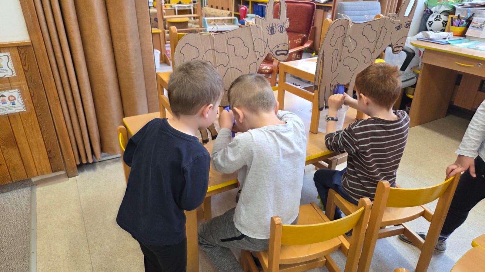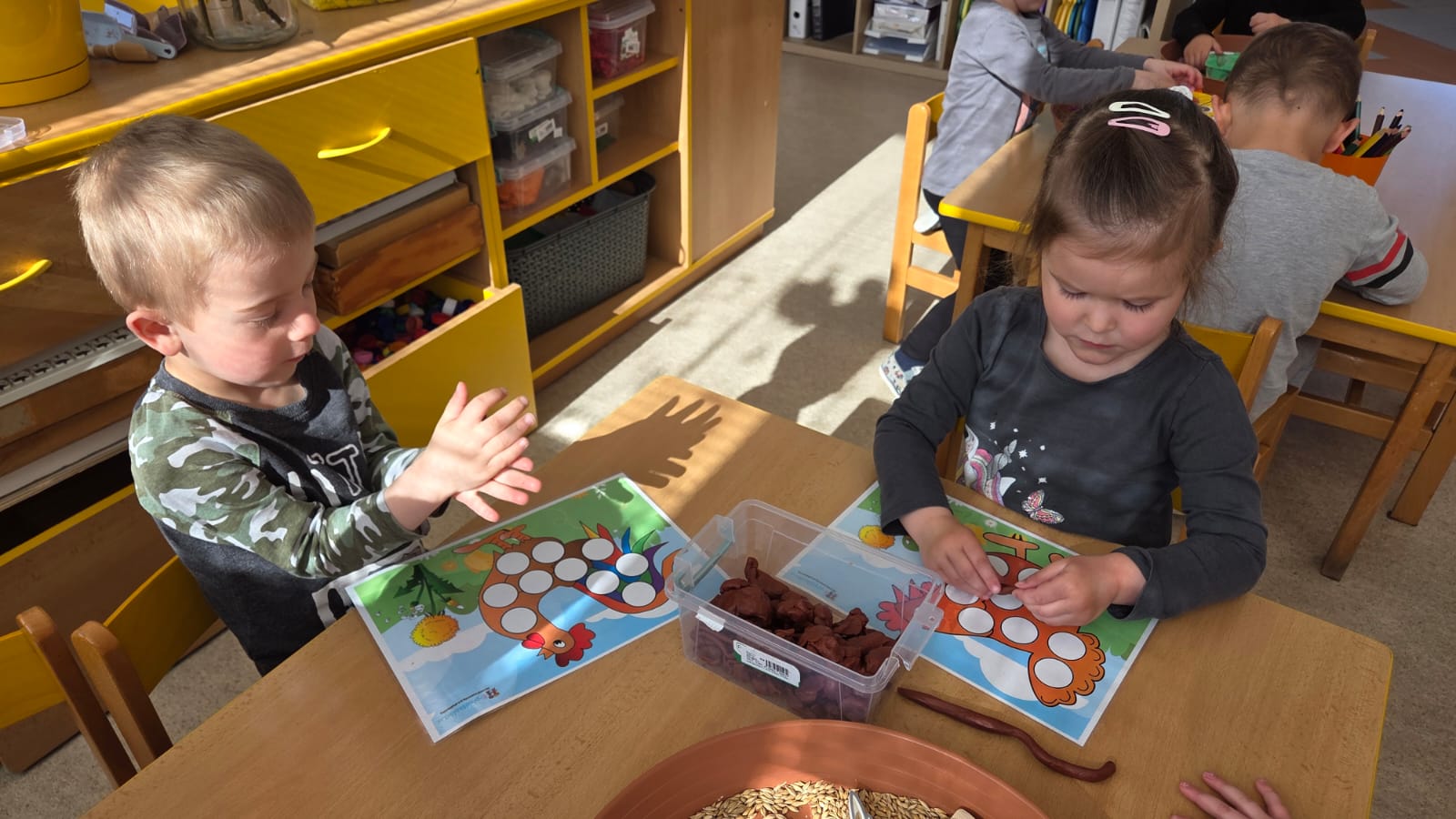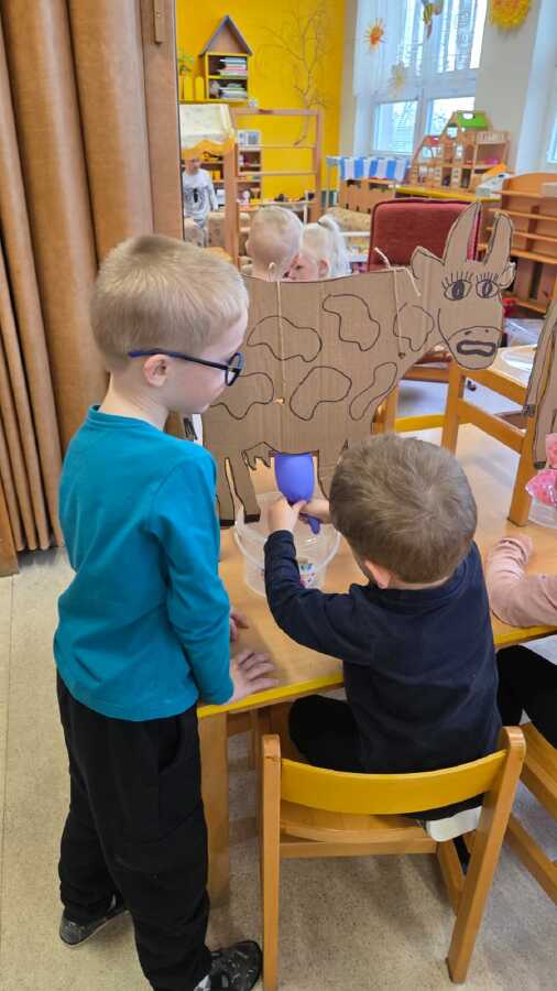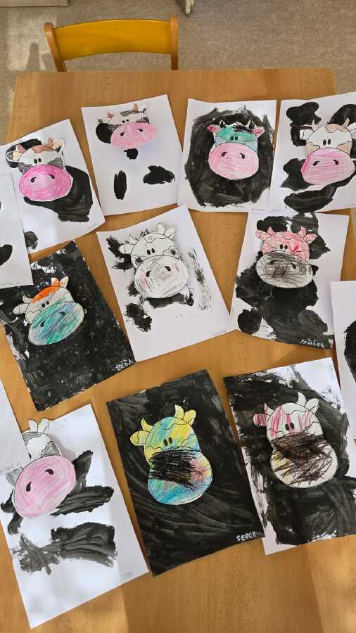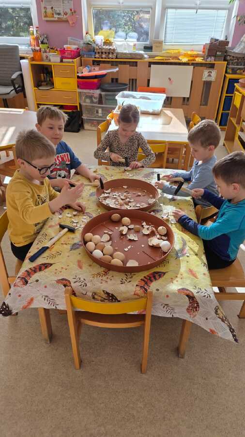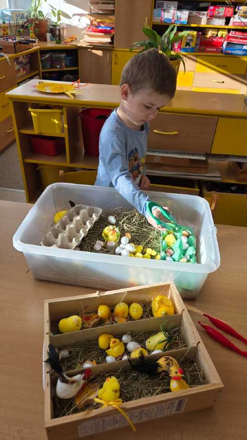 POTOM NA DĚTI ČEKALY DROBNÉ ÚKOLY JAKO POČÍTÁNÍ VAJÍČEK, SESTAVENÍ OBRÁZKŮ Z ČÁSTÍ NEBO VYHLEDÁVÁNÍ GEOMETRICKÝCH TVARŮ A SKVRN NA KRAVIČKÁCH.