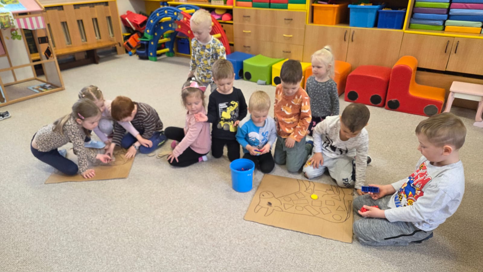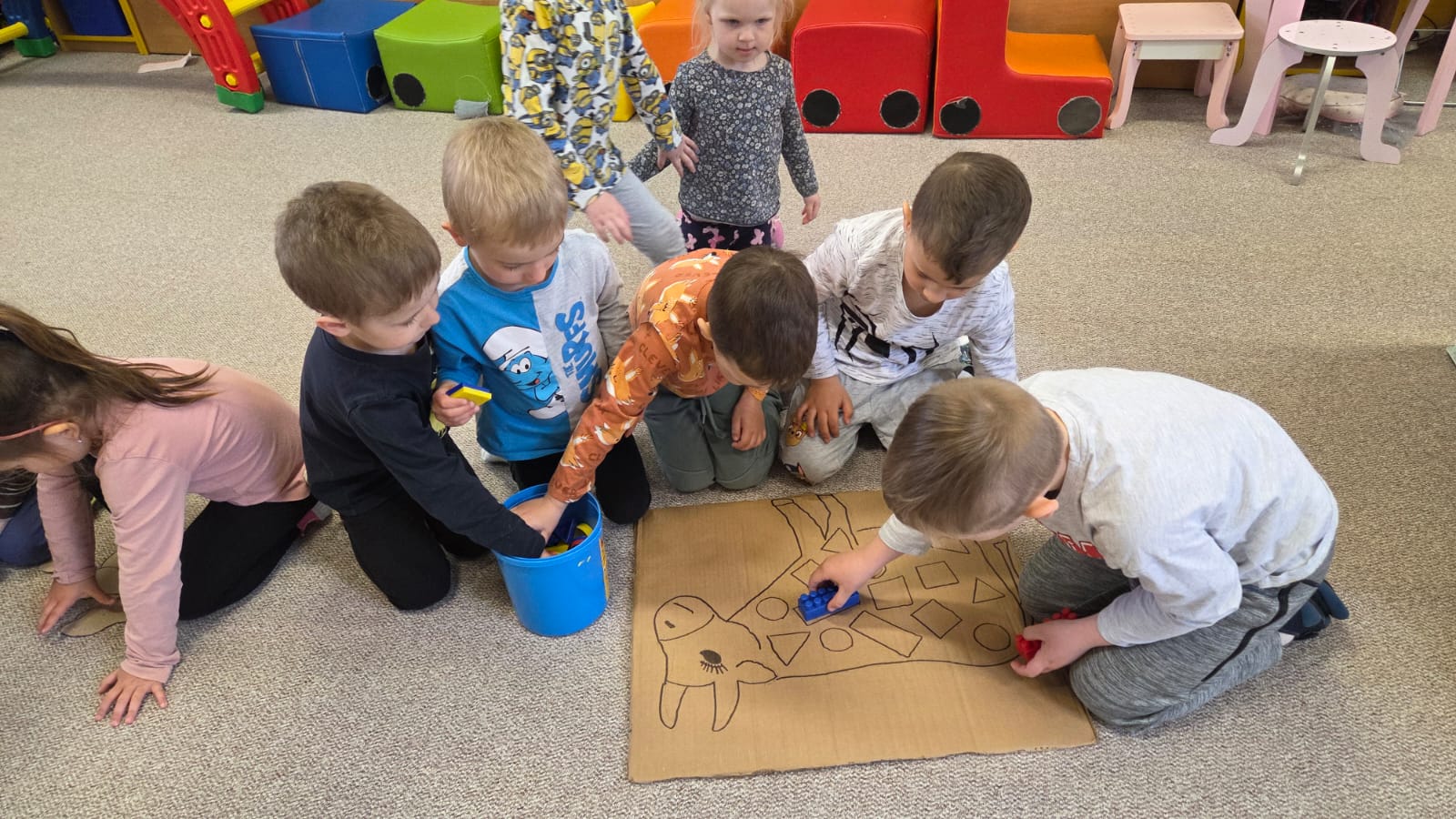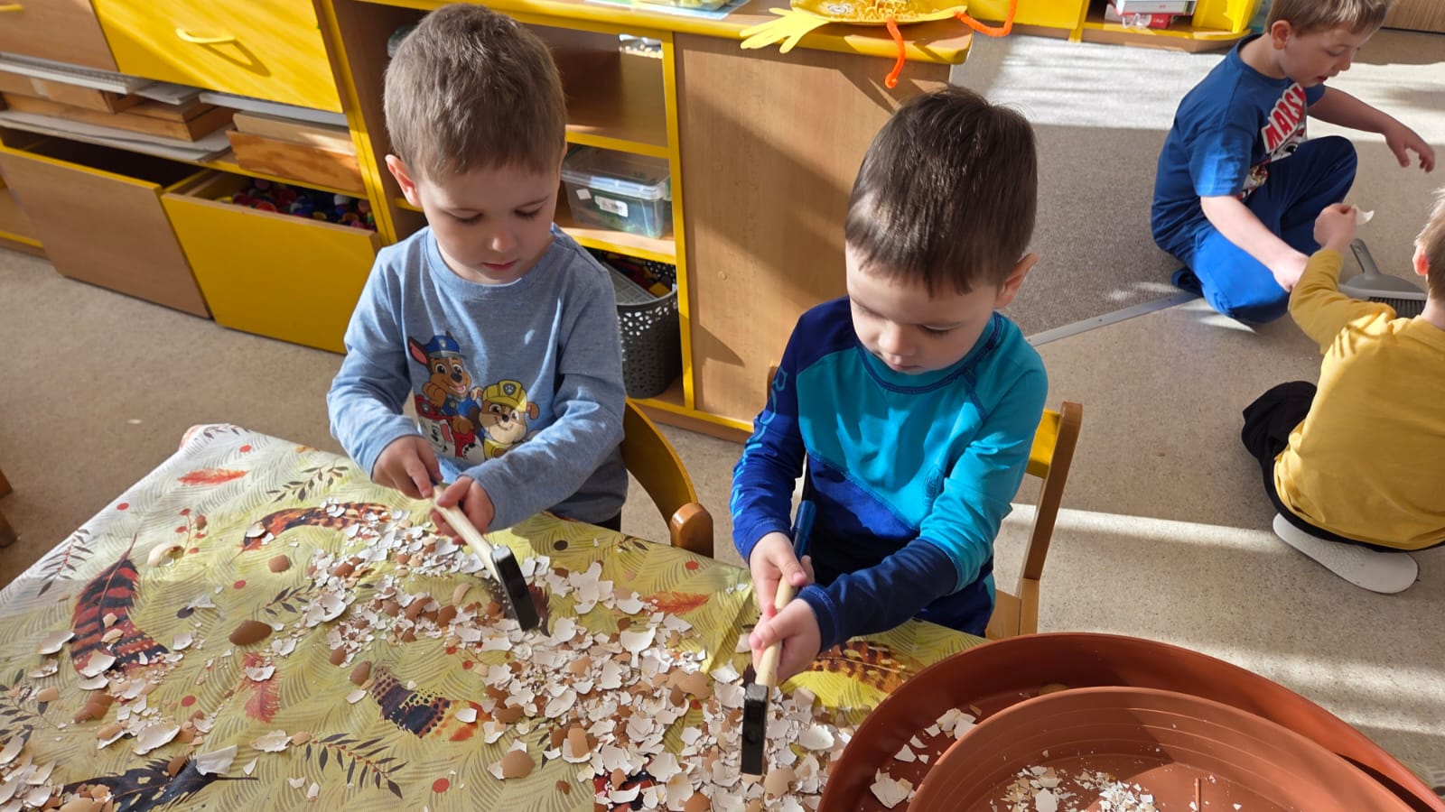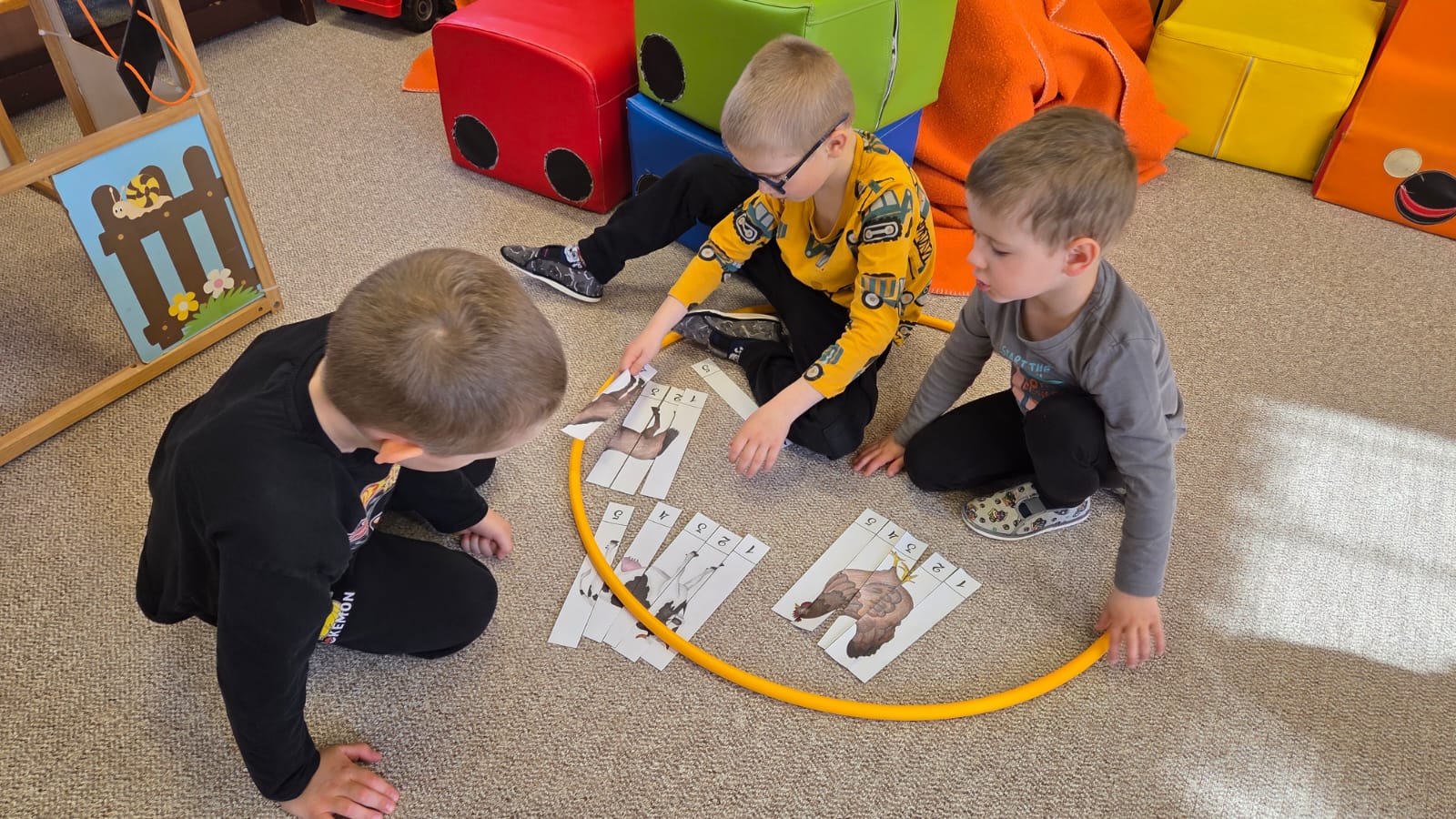 POTOM NA DĚTI ČEKALY DROBNÉ ÚKOLY JAKO POČÍTÁNÍ VAJÍČEK, SESTAVENÍ OBRÁZKŮ Z ČÁSTÍ NEBO VYHLEDÁVÁNÍ GEOMETRICKÝCH TVARŮ A SKVRN NA KRAVIČKÁCH.