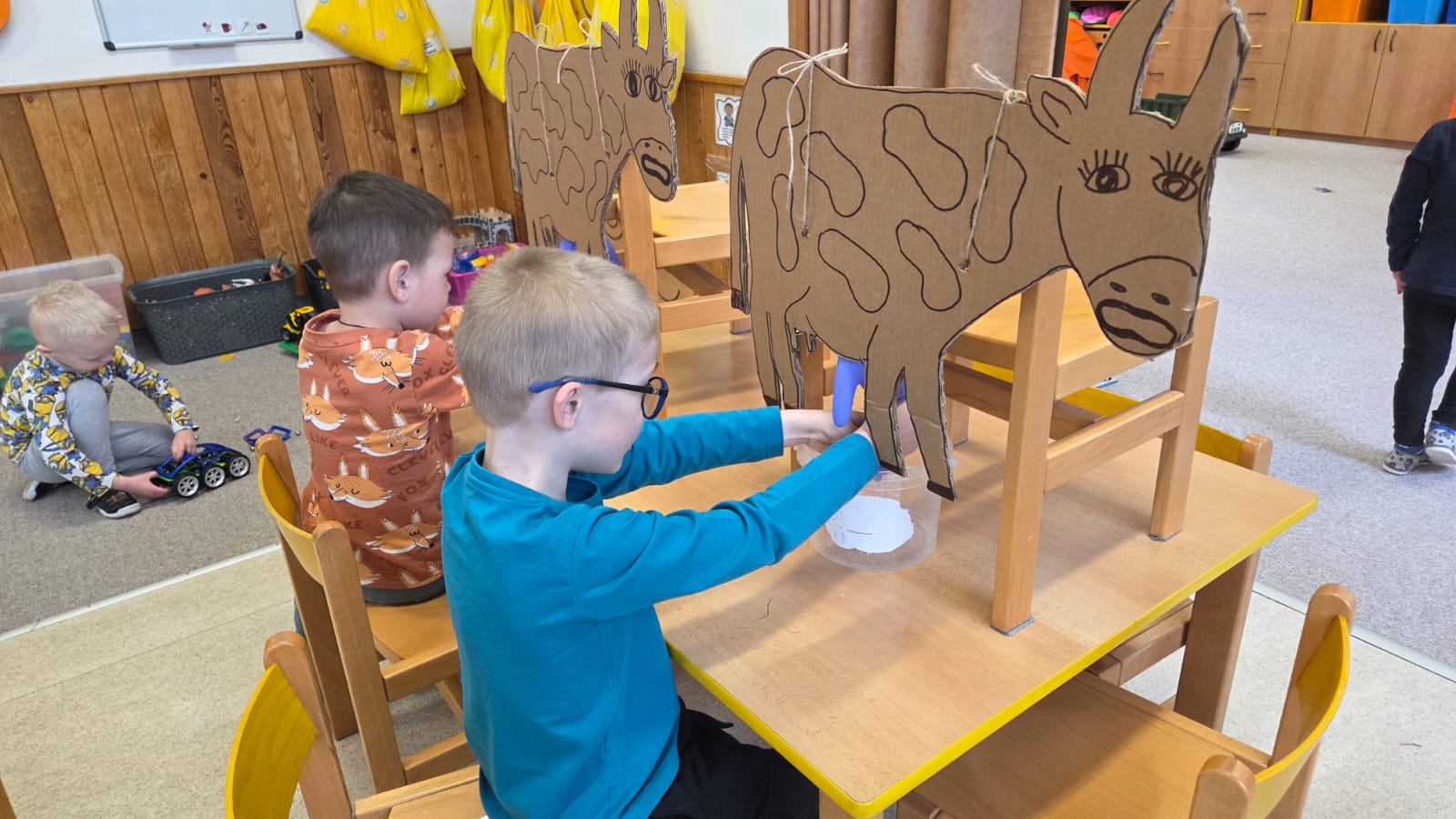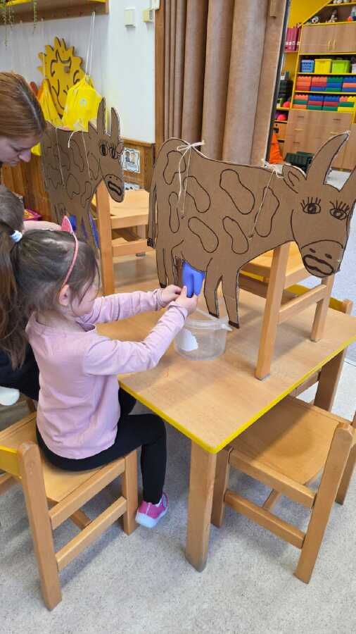V PÁTEK UŽ NA DĚTI ČEKALO MALÉ PŘEKVAPENÍ, A TO DOJENÍ KRAVIČKY A SMYSLOVÝ CHODNÍČEK Z NAŠÍ FARMIČKY. JEDNOTLIVÉ ČÁSTI CHODNÍČKU SI DĚTI POJMENOVALY PODLE POUŽITÉHO MATERIÁLU. TAK NAPŘÍKLAD, SENO JAKO PODESTÝLKA PRO ZVÍŘÁTKA,