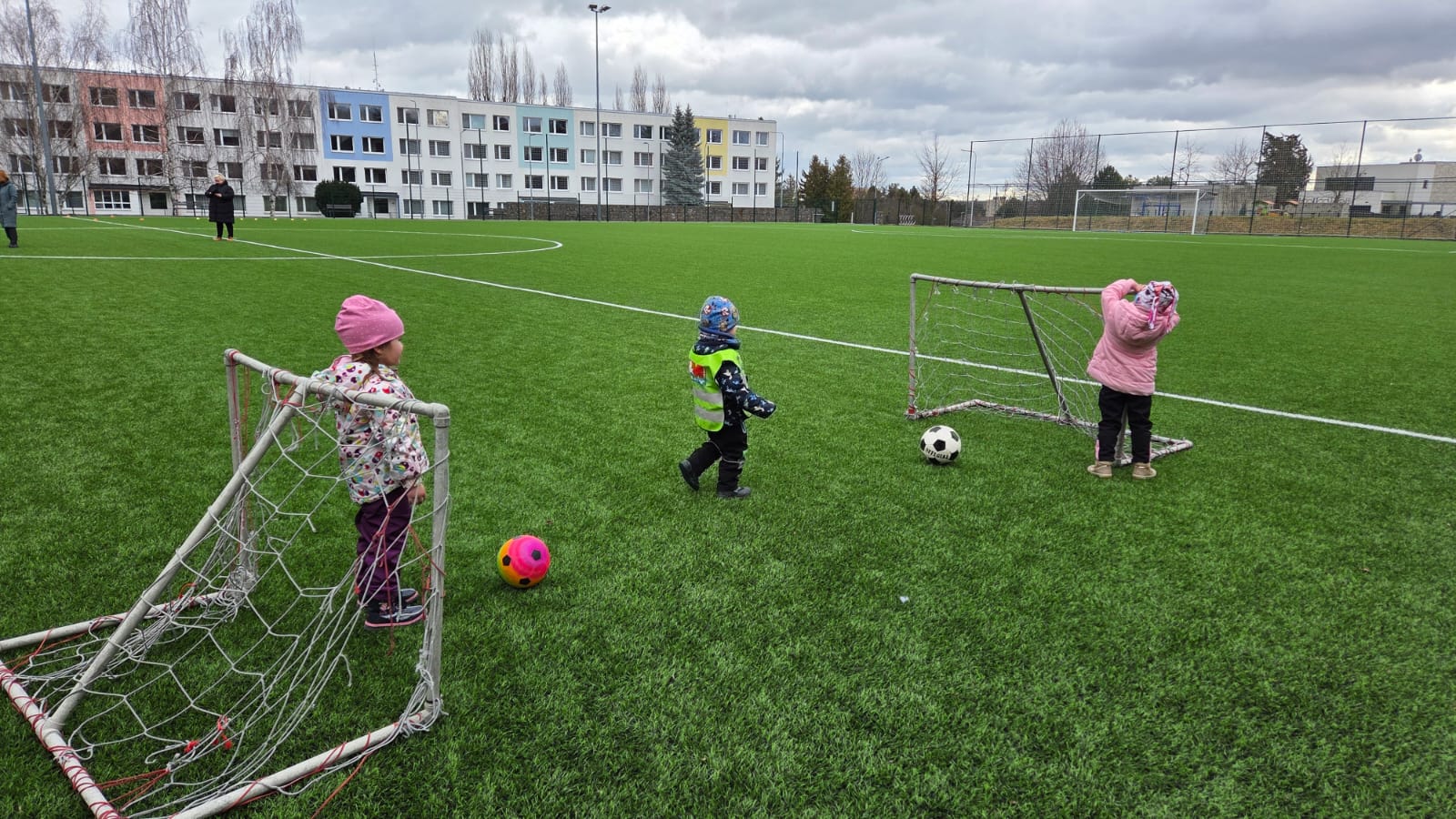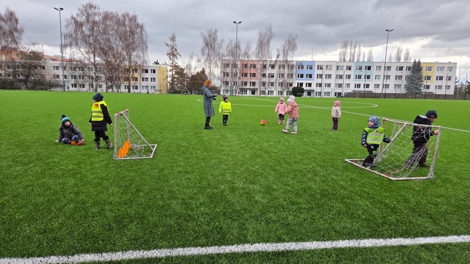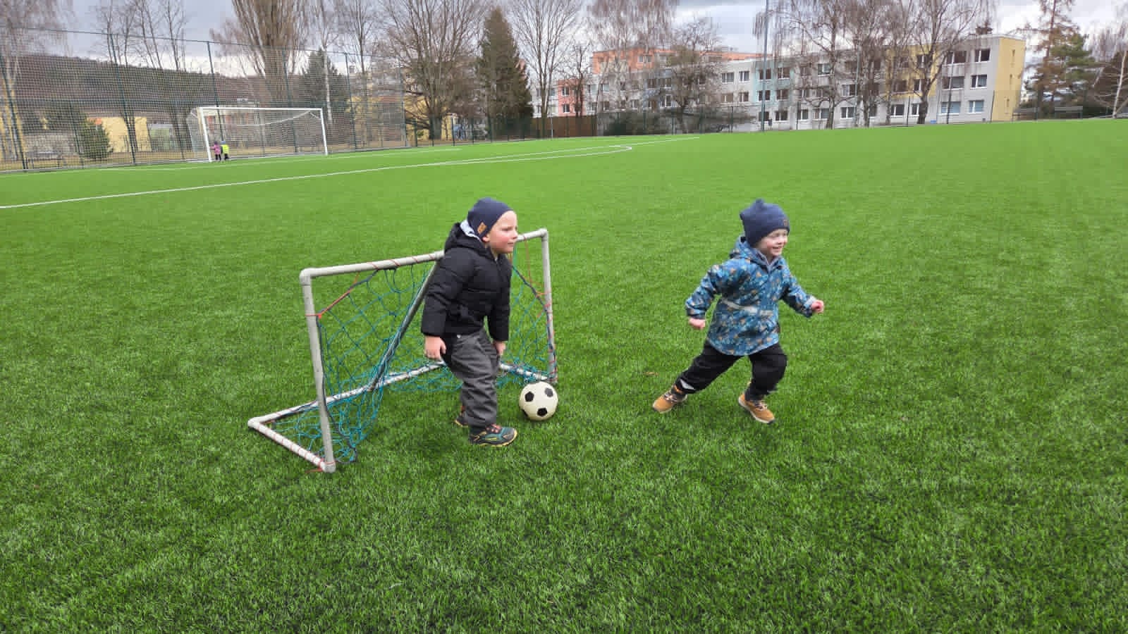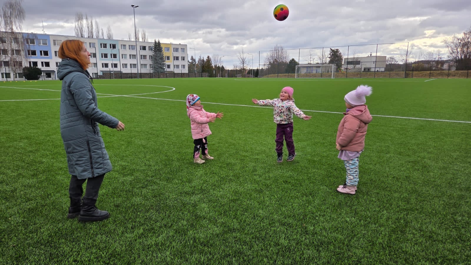 DĚTI HRÁLY FOTBAL,HÁZELY SI MÍČEM NA VELIKÉM HŘIŠTI.TAKÉ JSME NAKRMILI KAČENKY NA RYBNÍCE. A VYZKOUŠELI JSME JAKÉ JE TO PO ZIMĚ NA PÍSKOVIŠTI