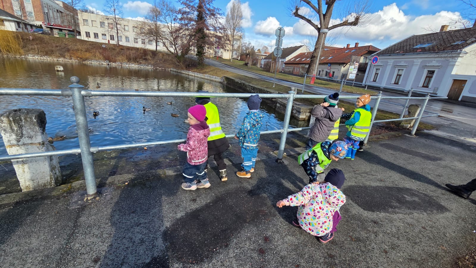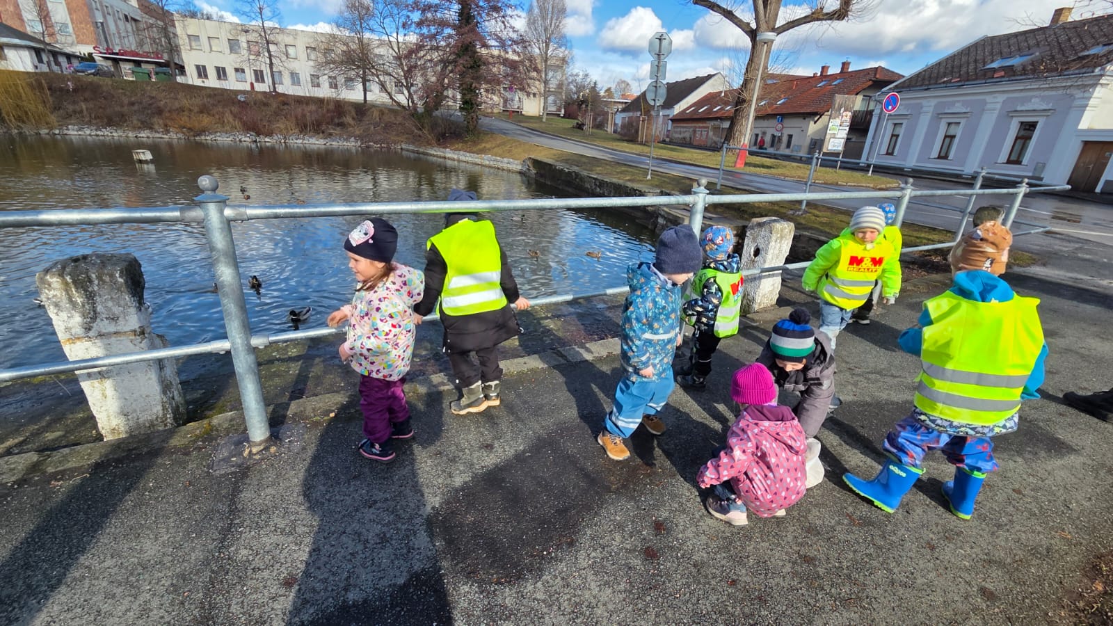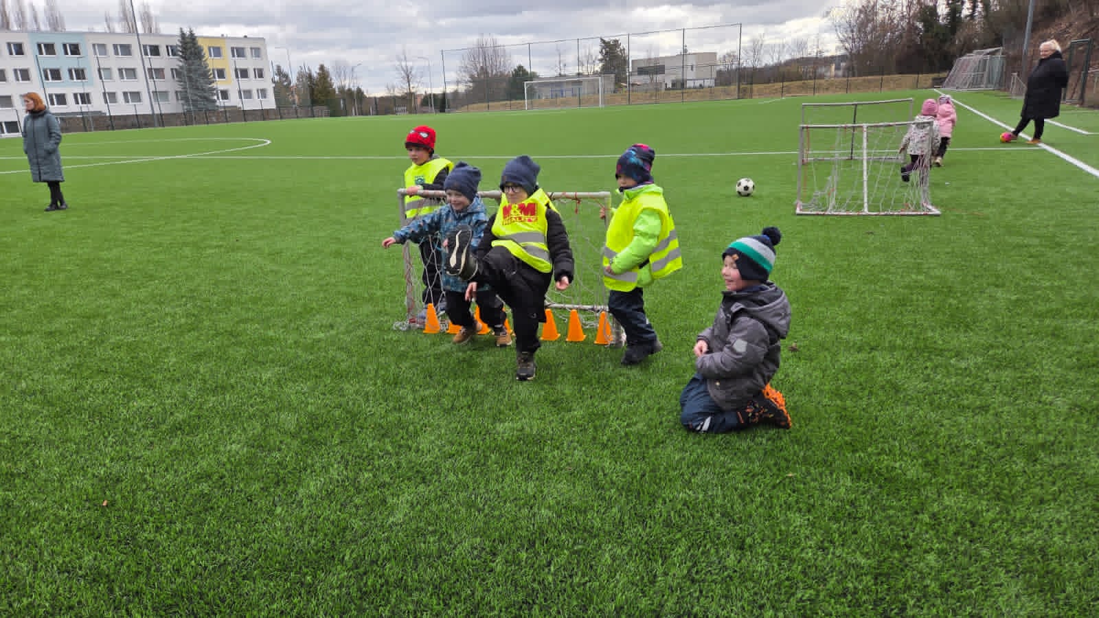 DĚTI HRÁLY FOTBAL,HÁZELY SI MÍČEM NA VELIKÉM HŘIŠTI.TAKÉ JSME NAKRMILI KAČENKY NA RYBNÍCE. A VYZKOUŠELI JSME JAKÉ JE TO PO ZIMĚ NA PÍSKOVIŠTI