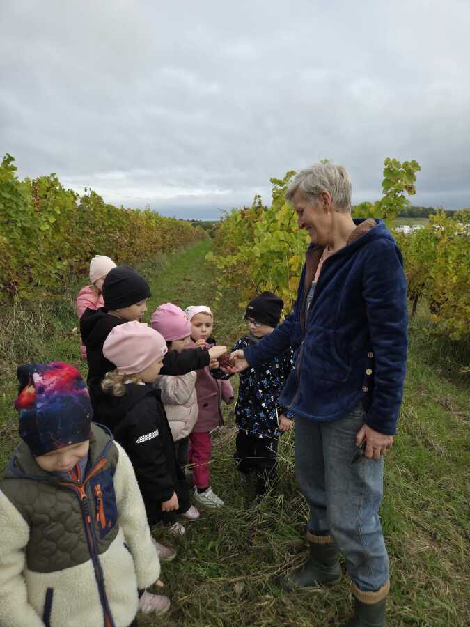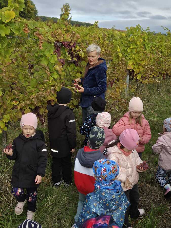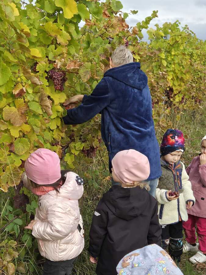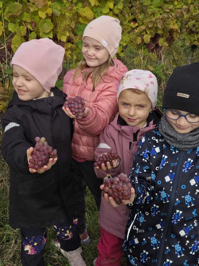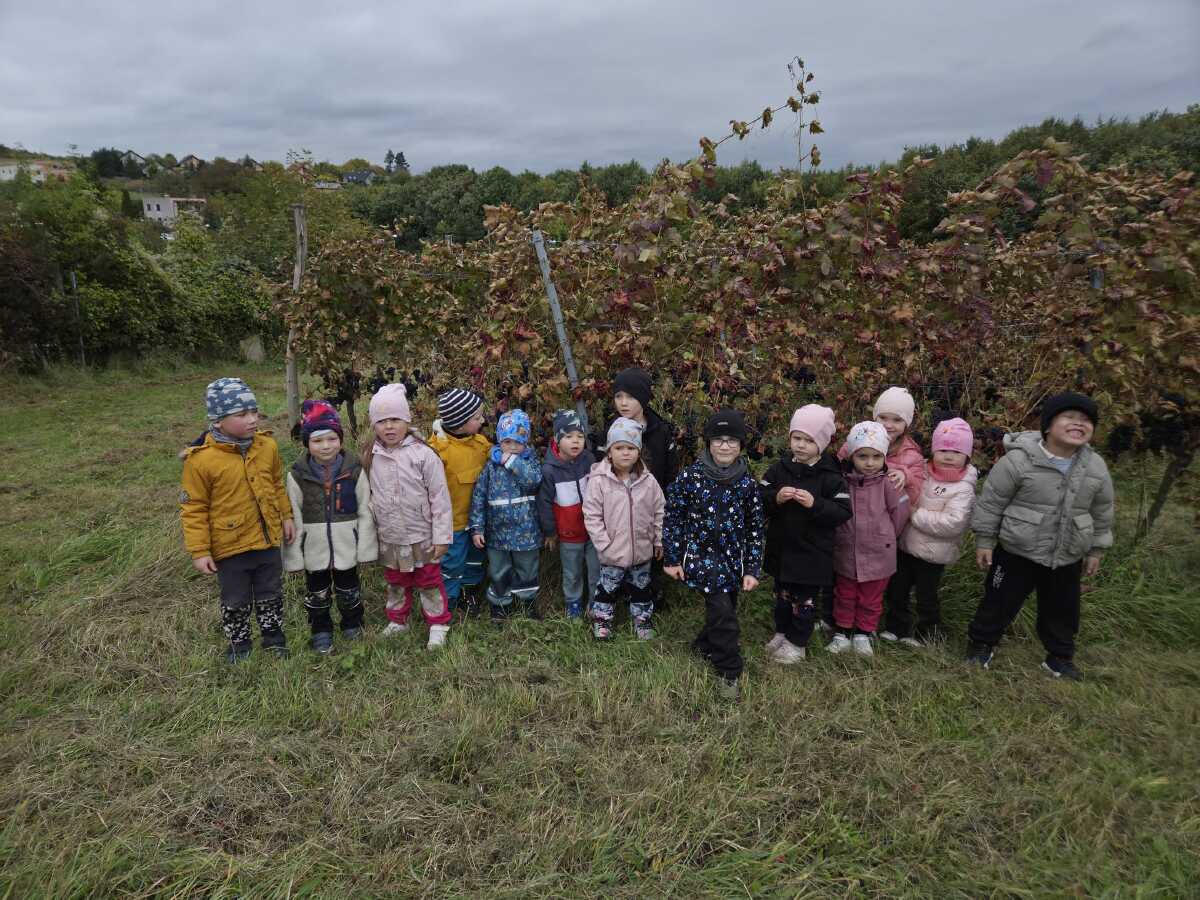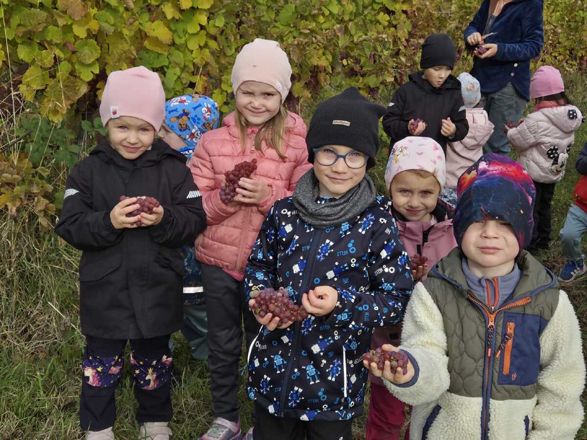 DNEŠNÍ DEN JSME SI OPRAVDU UŽILI.NAVŠTÍVILI JSME VINAŘSTVÍ ŽÁČEK. PANÍ ŽÁČKOVÁ SE NÁS MILE UJALA,VYPRÁVĚLA DĚTEM JAK SE VINNÁ RÉVA PĚSTUJE A JAK SE O HROZNY DÁL PEČUJE CELÝ ROK ,NEŽ-LI SE SKLÍZÍ. DĚTI MOHLY VŠECHNY DRUHY I BARVY HROZNŮ OCHUTNAT,PROHLÉDNOUT SI JAK ROSTOU.