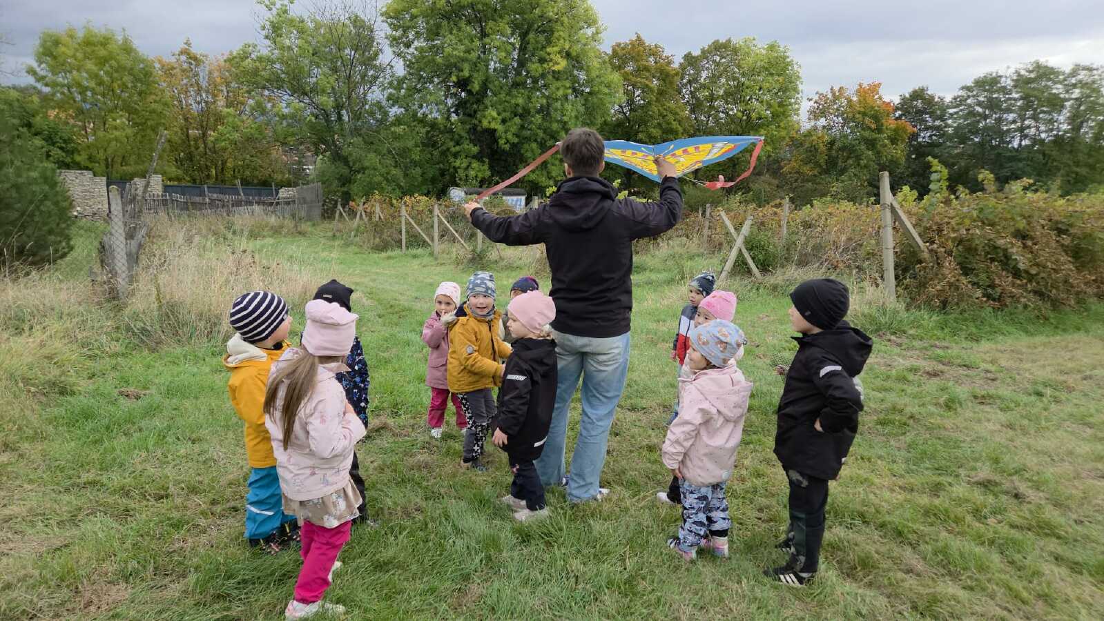 JAKO PŘEKVAPENÍ MĚLA PANÍ ŽÁČKOVÁ PRO DĚTI PŘIPRAVENÉHO DRAKA. PAN UČITEL HO S DĚTMI SESTAVIL A UŽ SE LÉTALO