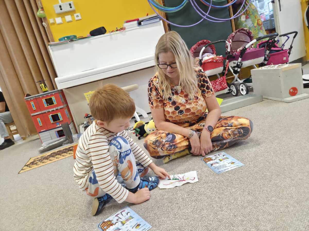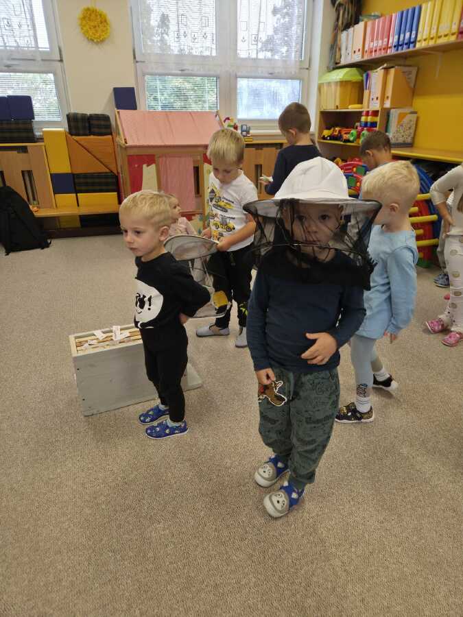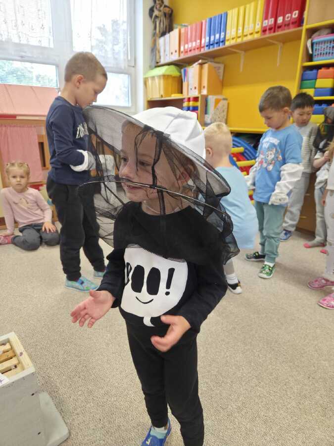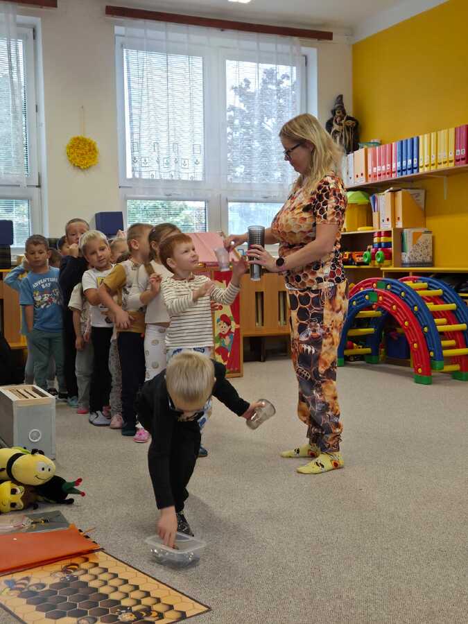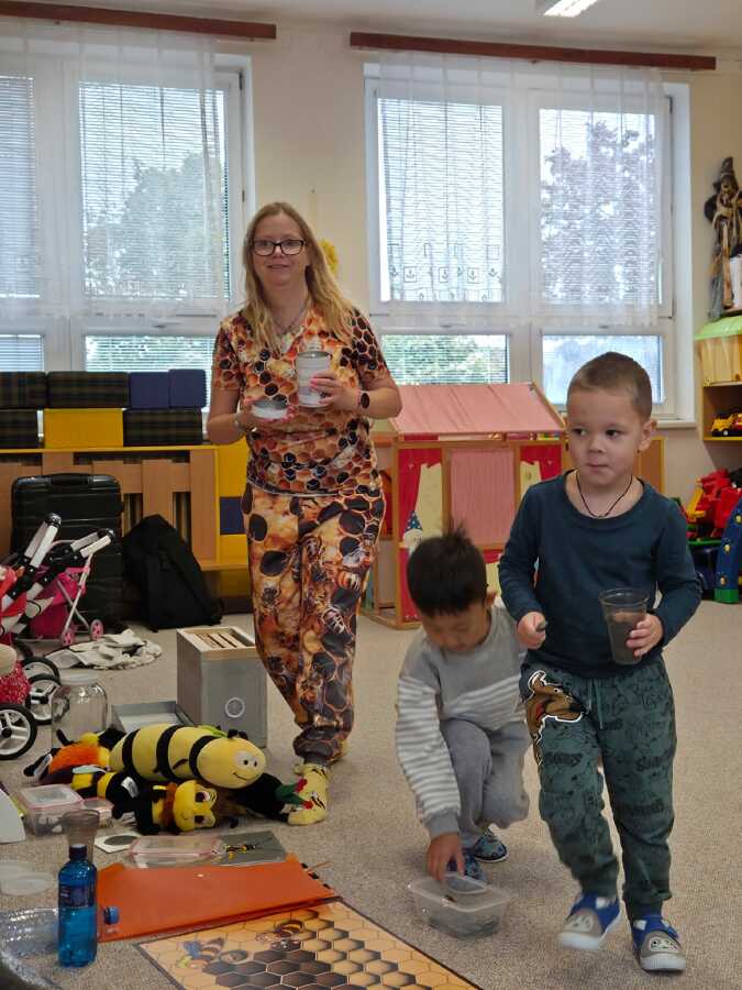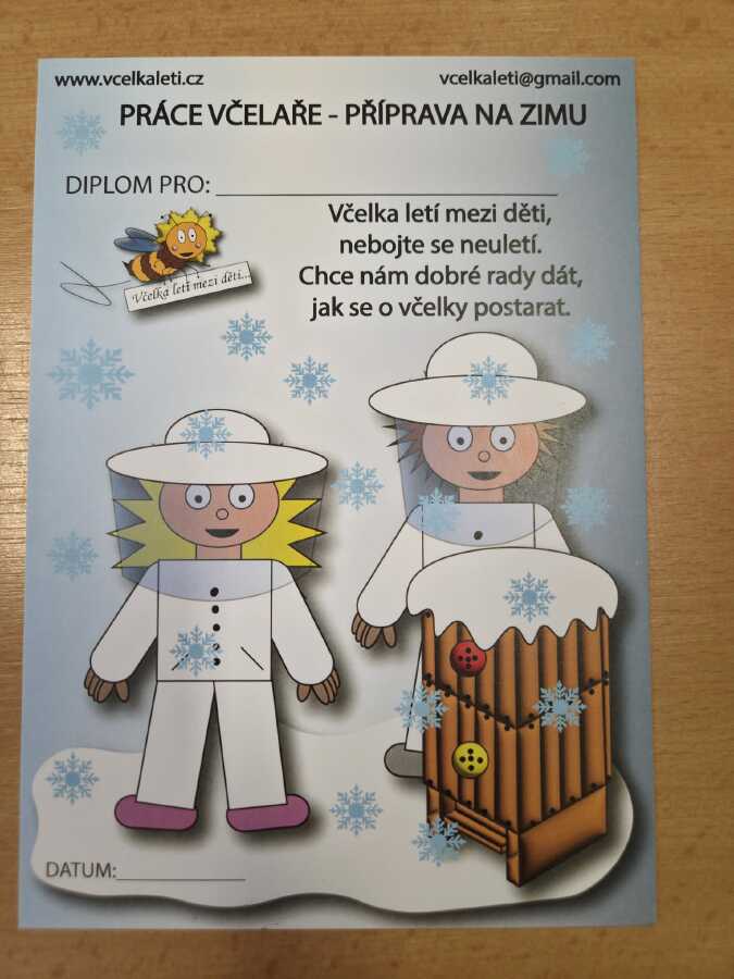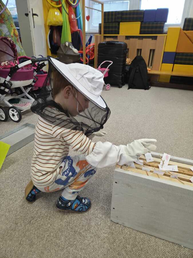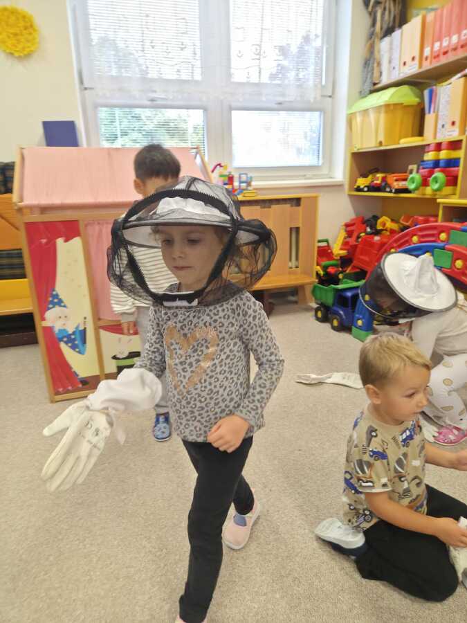 PANÍ VČELAŘKA VELMI PĚKNĚ VYPRÁVĚLA DĚTEM JAK TO CHODÍ V ÚLE,JAK SE VČELIČKY CHYSTAJÍ NA ZIMU.OHŘÍVAJÍ SI KRÁLOVNU A TULÍ SE K SOBĚ.PŘES ZIMU JE VČELAŘI PŘIKRMUJÍ SLADKOU VODOU A TU SI DĚTI SPOLEČNĚ VYROBILY A OCHUTNALY.TAKÉ SE DOZVĚDĚLY KDO VČELIČKÁM ŠKODÍ.A VYZKOUŠELY SI VYROBIT LÉK PRO NEMOCNÉ VČELKY