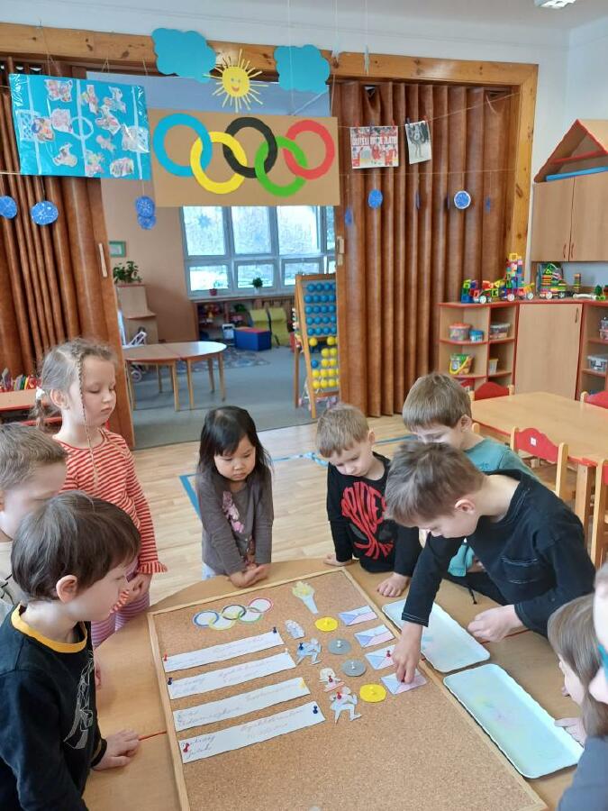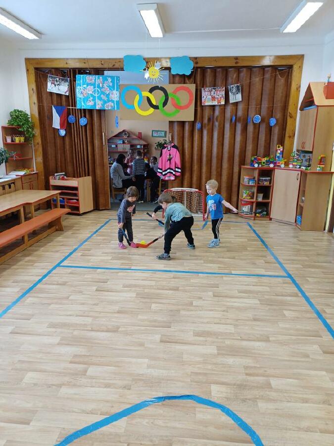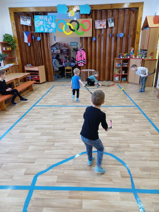 Zimní olympiáda-koulovačka v herně,zápasy v ledním hokeji na"krytém stadionu",umísťování zlatých a stříbrných medailí našim olympionikům na výsledkovou tabuli