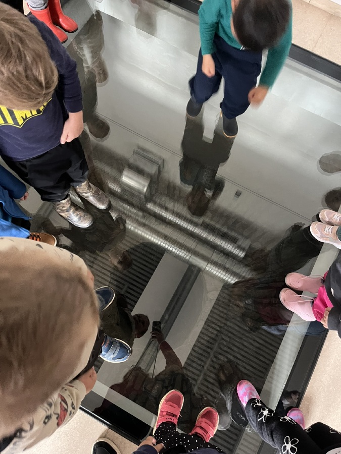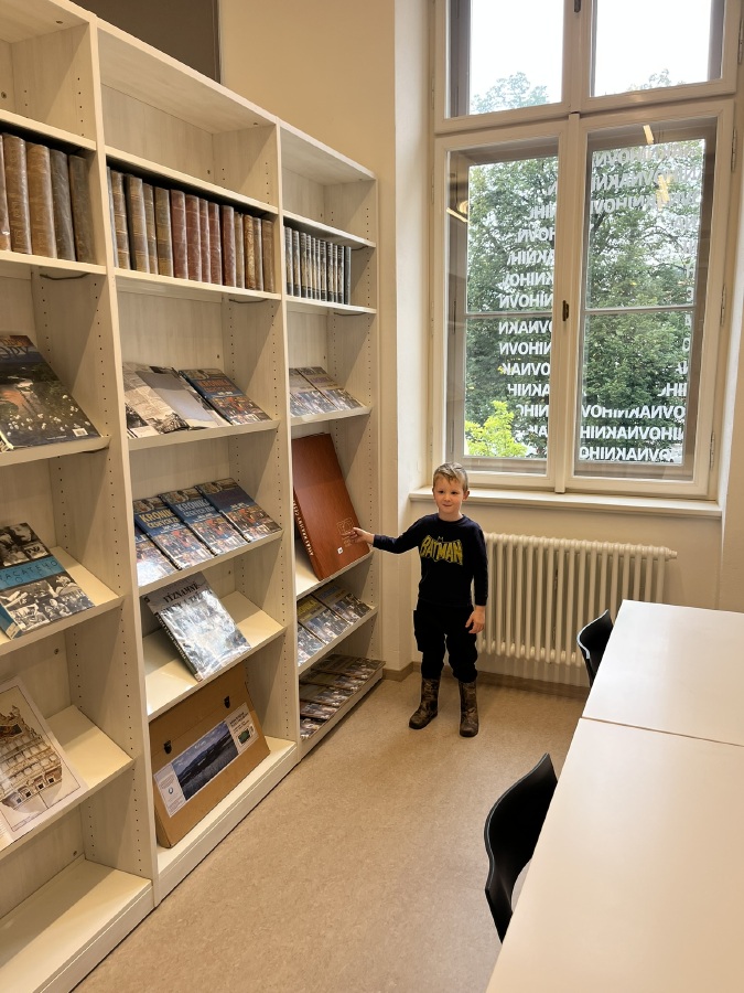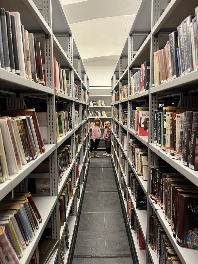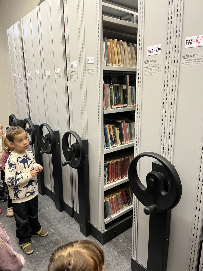 Vypravili jsme se na prozkoumání knihovny! Podívali jsme se do sklepa, kde je velká klouzačka pro knížky, taky jak se knížky třídí, ukládají a proč je k tomu potřeba volant :-)