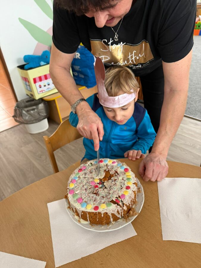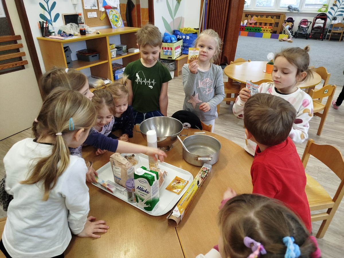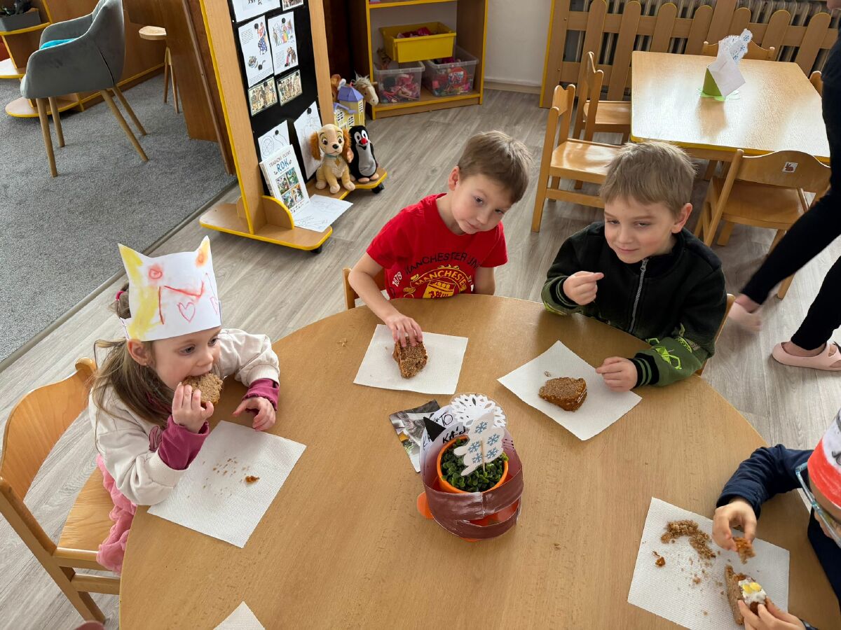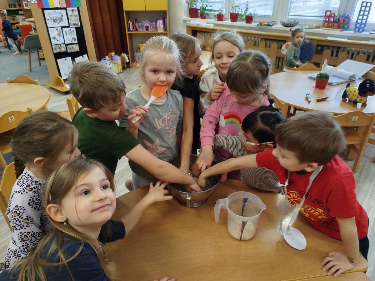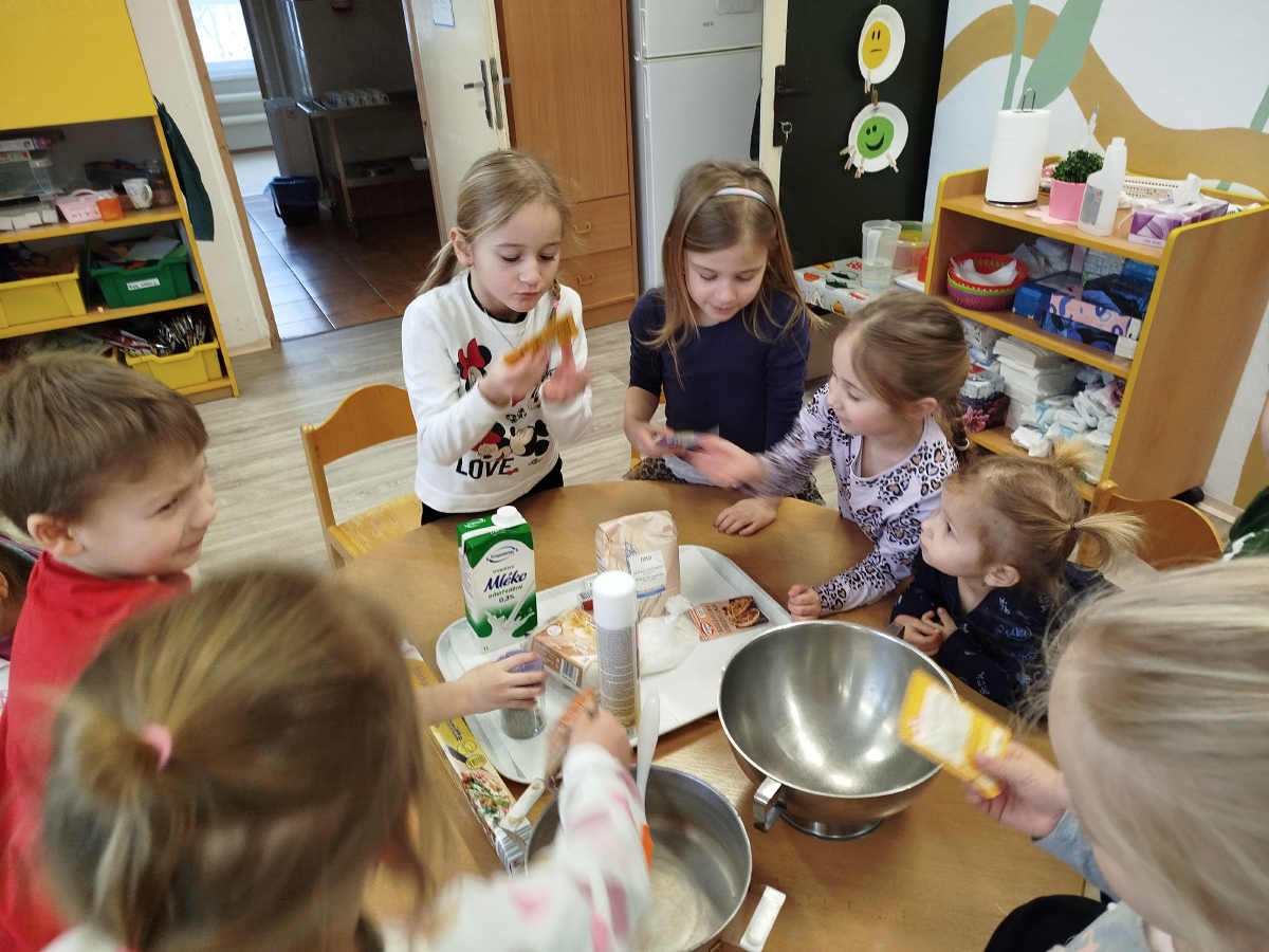 Masopustní úterý začalo u nás ve Žluté kytičce pečením masopustního dortu z perníkového těsta. Všichni jsme se podíleli na jeho výrobě. Poznávali jsme suroviny nejen podle zraku, ale i podle vůně. Jsme moc šikovní, paní učitelka nám skoro vůbec nemusela pomáhat. Dort se mám povedl, voněl na celý pavilon. Polili jsme ho bílou čokoládou a ozdobili lentilkami a sypáním. Snědli jsme ho celý, nezbyl ani drobeček. Se stejnou chutí jsme nakonec snědli i oběd. MŇAM!