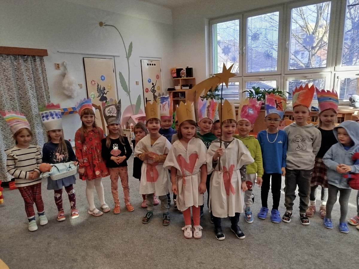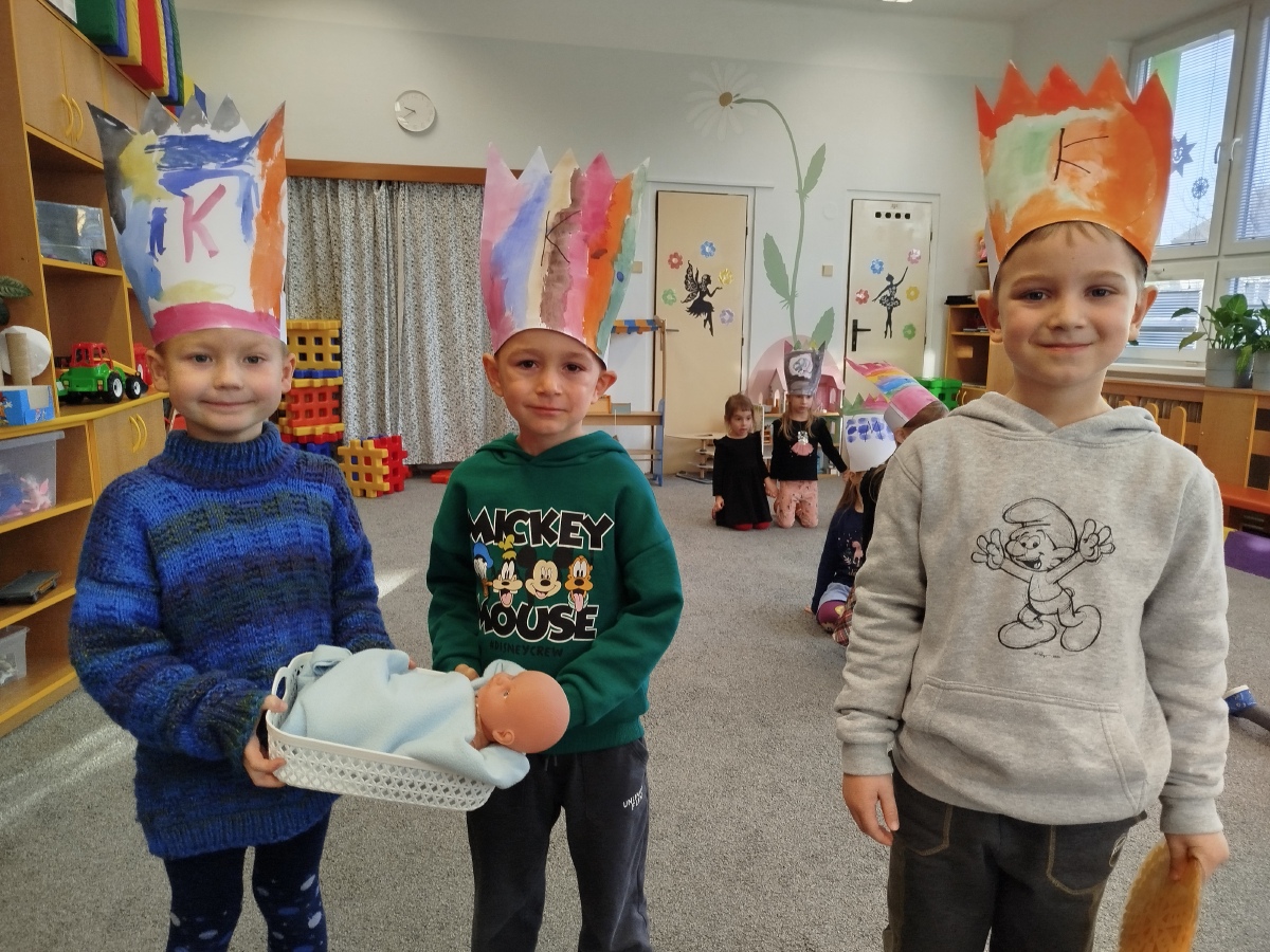 Dnes k nám do Žluté kytičky přišli na návštěvu Tři králové z Červené kytičky. My jsme si ráno vyrobili královské koruny a zahráli si na Tři krále a putovali za Ježíškem. Museli jsme sledovat cestu podle vloček k Ježíškovi a procvičili si chůzi ve trojicích.Nakonec jsme si naposledy zazpívali koledy a tím jsme ukončili vánoční čas. Hodně štěstí a zdraví v novém roce!