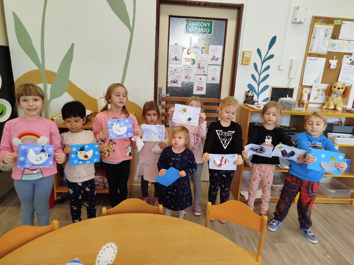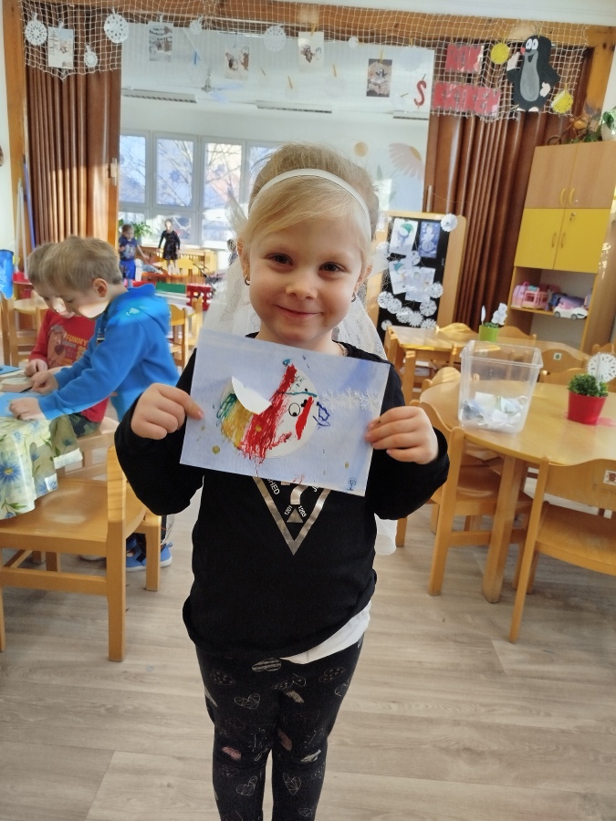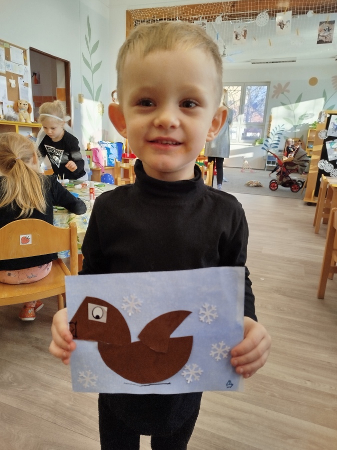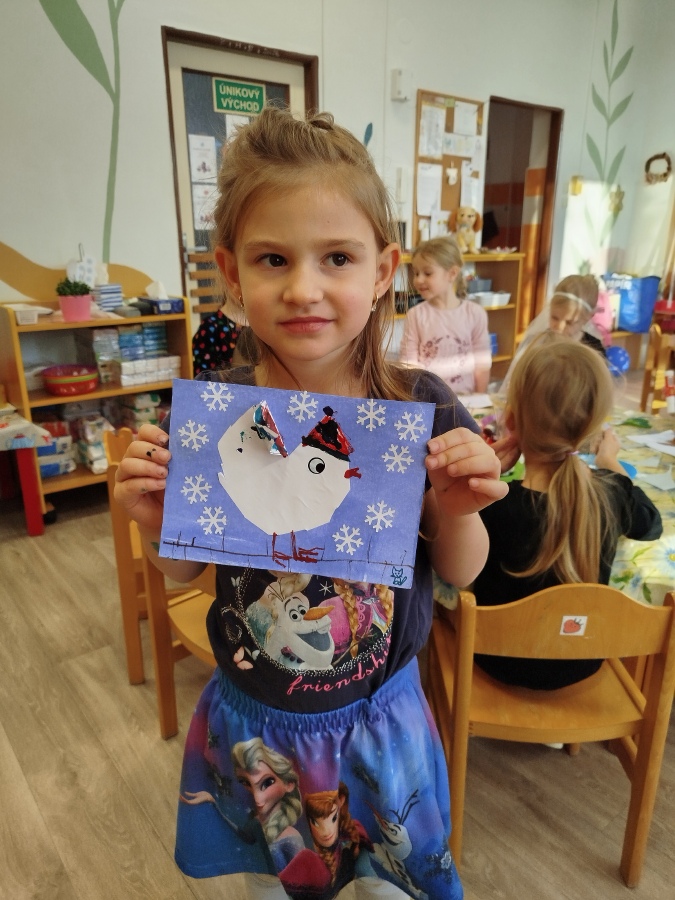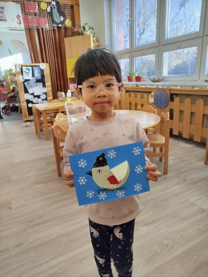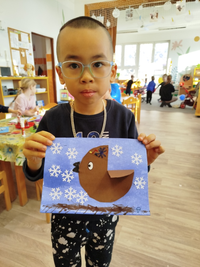 My Žluťáskové máme ve školce na zahradě svůj ptačí strom. Je na něm ptačí budka a krmítko. Teď v zimě každý den krmíme ptáčky slunečnicovými semínky. A protože máme ptáčky rádi a líbí se nám, vytvořili jsme obrázky ptáčka v zimě :))